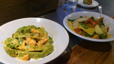 サーモンクリームパスタにはホウレン草が練り込まれた麺でした。