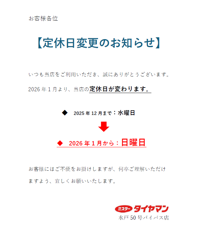 定休日変更のお知らせ 2025年11月15日 いつも当店をご利用いただき、誠にありがとうございます。 誠に勝手ながら、2026年1月から定休日が変更となります。 何卒ご理解の程、よろしくお願いいたします。