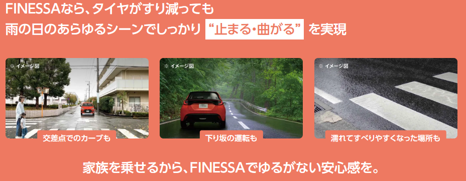 雨のち、フィネッサ ENLITEN技術搭載タイヤ 『資源循環性』『静粛性』『WET性能』 タイヤの溝が減っても、高いウェット性能を発揮するタイヤ。 2月販売予定!!