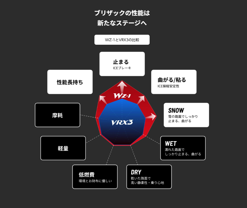 ブリザックはENLITENで生まれ変わる。 2025年9月 販売予定!! 『ブリザック史上、断トツのICEコントロール性』 『アイス、スノー、シャーベット、ウェット、ドライ、 日本の冬道で想定される、様々な路面状況に対して、高水準に対応』 『性能長持ちでサステナビリティの貢献』 こうご期待ください!!