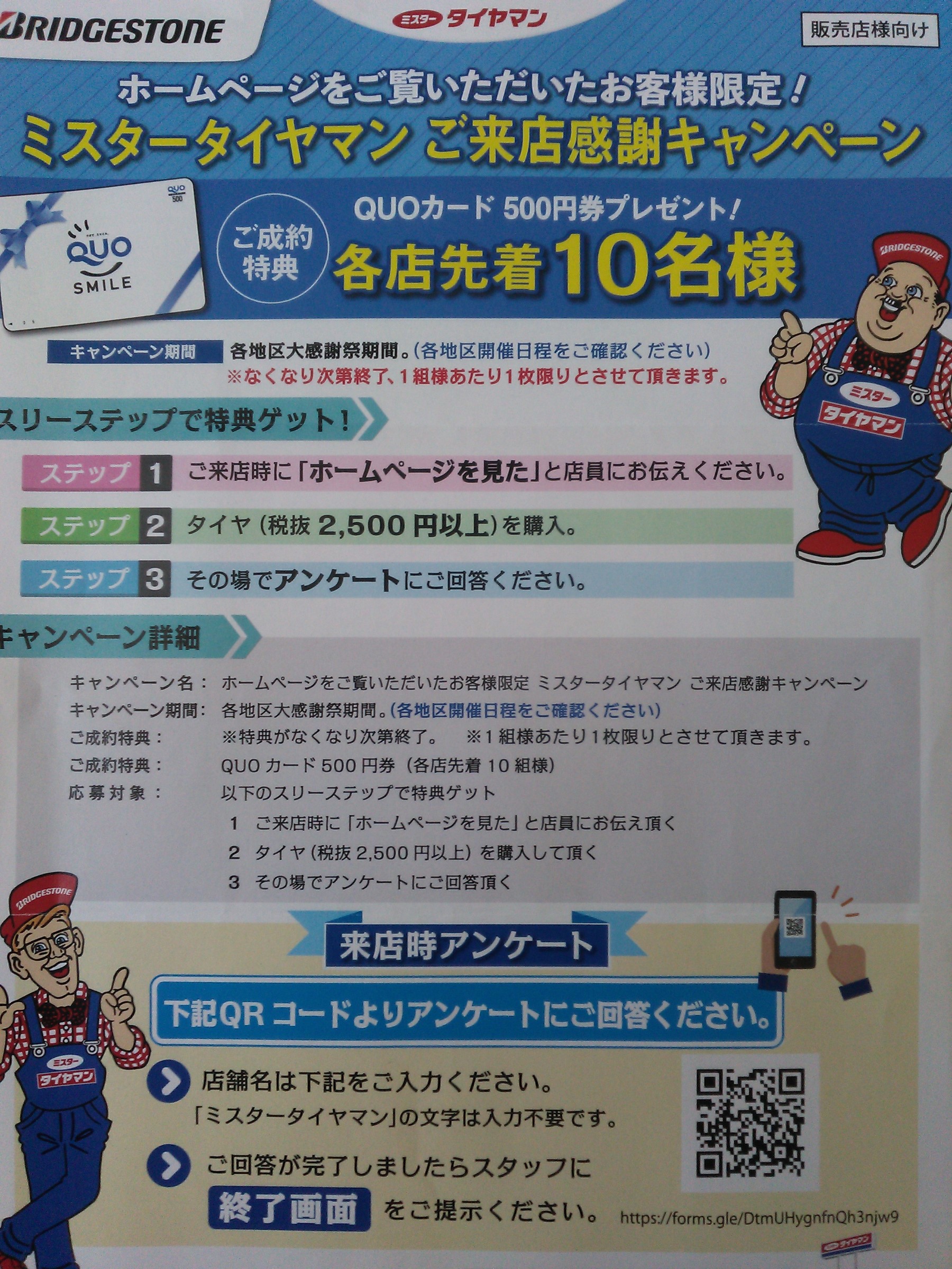 とお伝えいただき2500円(税別)以上のタイヤを購入&簡単なアンケートにお答えいただいたお客様に