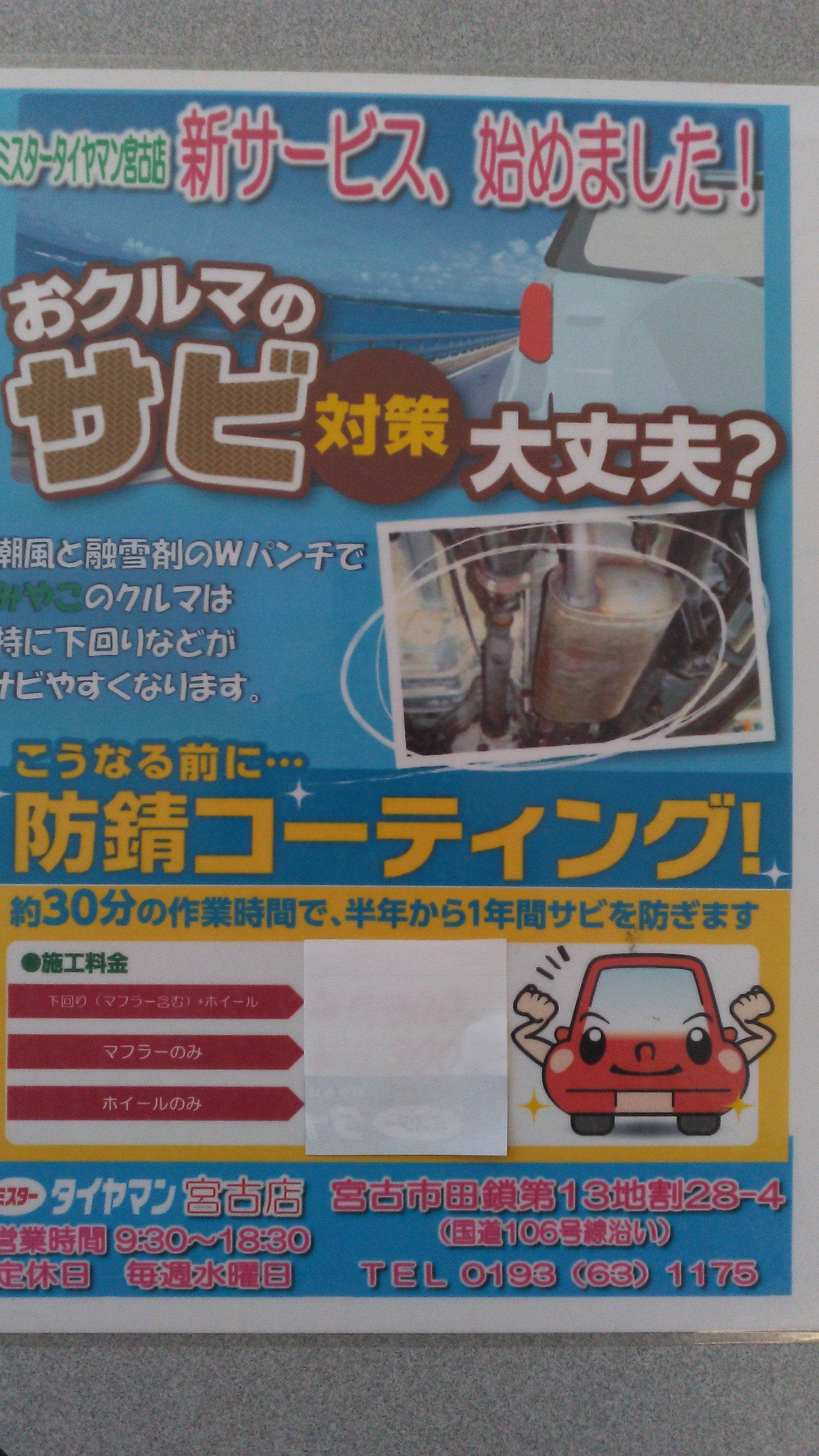 三陸沿岸の潮風と冬期の融雪剤のWパンチ! 宮古地区のお客様のお悩みかと思いますがそんな時はミスタータイヤマン宮古店で (防錆コーティング) 約30分の作業で半年から1年の間錆を防ぎます! 下廻り防錆をされているお客様にも朗報! 当店防錆コーティングはマフラー、ハブ等の部分施工も取り扱いがございます! 新車価格、中古相場も気になる近頃... お客様の愛車をお守りするお手伝いをさせてください!!