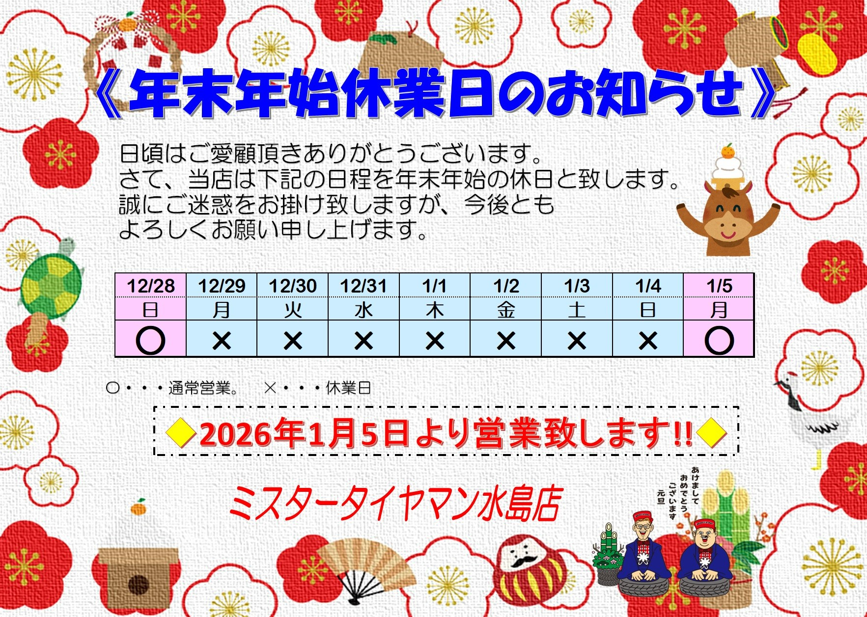 【年末年始休業日のお知らせ♪】 2025年12月8日 あっっっっという間に12月ですね・・・ 年末年始の準備はすすんでいますか? さて、当店の年末年始のお知らせです(^_^)/~ 2025年12月29日(月)~2026年1月4日まで休業致します!! 2025年も大変お世話になりました<m(__)m> 2026年もよろしくお願い致します!!