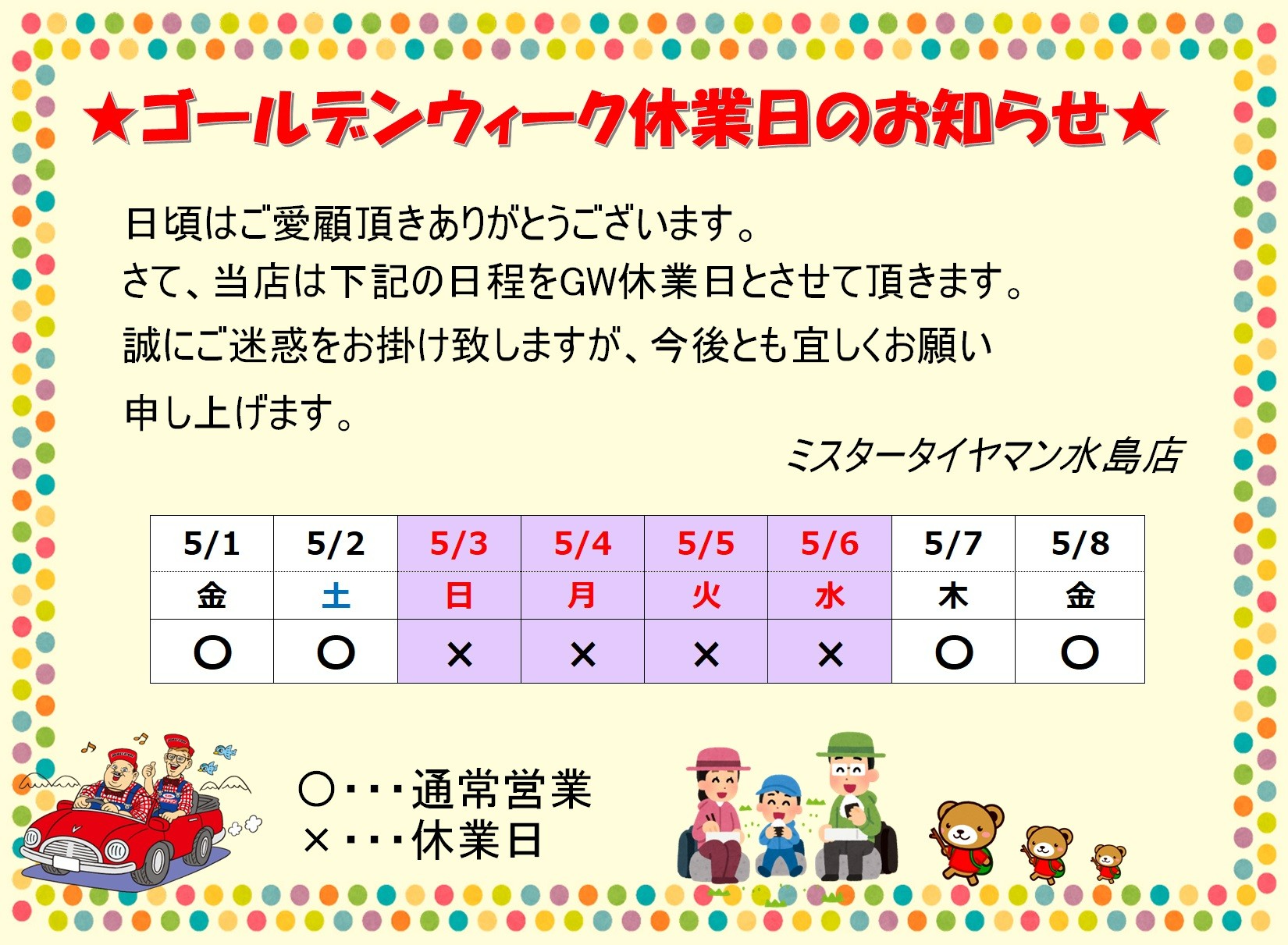 ゴールデンウイーク休業日のお知らせ 2026年4月20日 ~~ゴールデンウイーク休業日のお知らせ~~ こんにちは!!ミスタータイヤマン水島店です(*^^)v 当店では下記日程をゴールデンウイークの休業日と致します!! 5月3日(日)~5月6日(水) 5月7日(木)から通常営業です!! ご迷惑をお掛けしますが、今度ともよろしくお願いいたします<m(__)m> 関連記事 ご予約はこちら アクセスはこちら