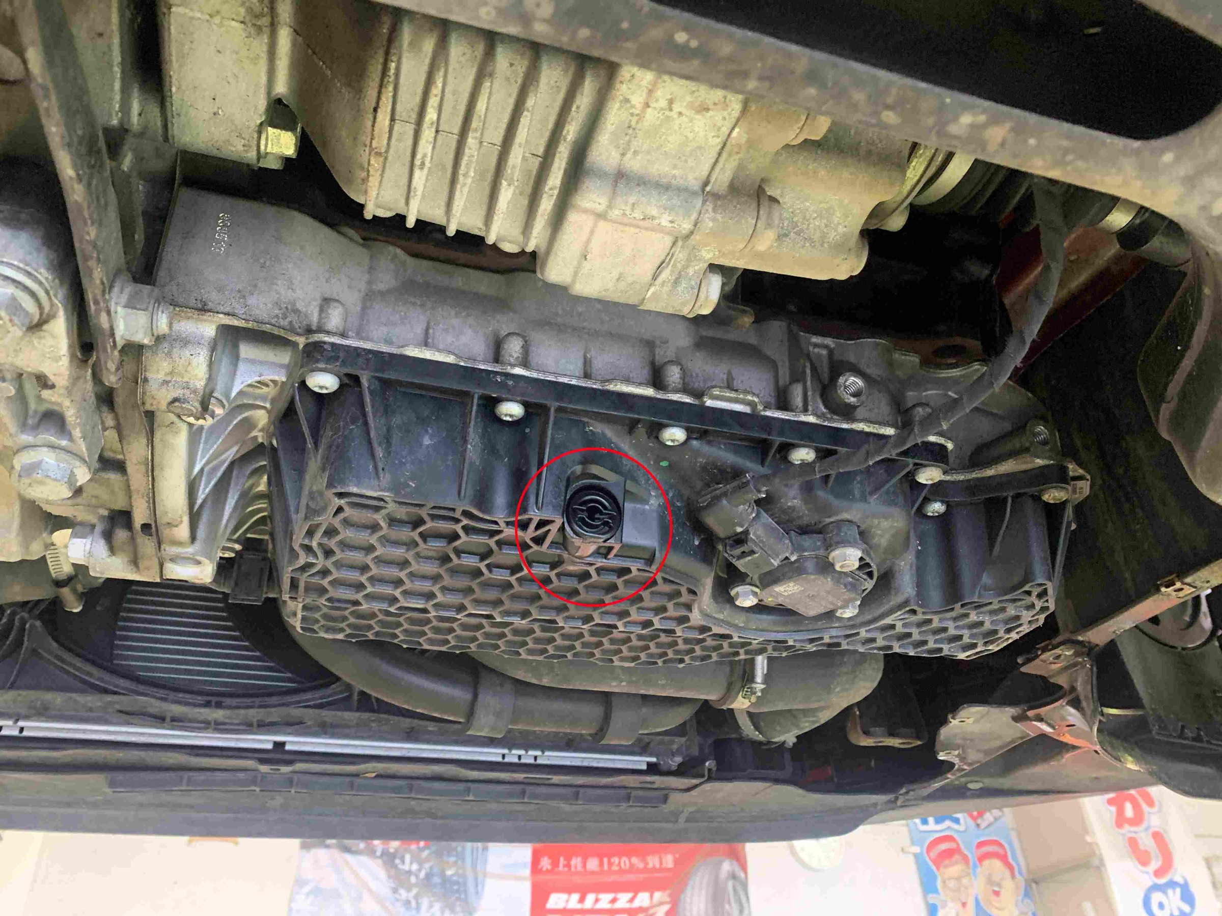 赤丸がドレンプラグ。 樹脂製のドレンでパッキンとセットなので毎回交換が基本です。