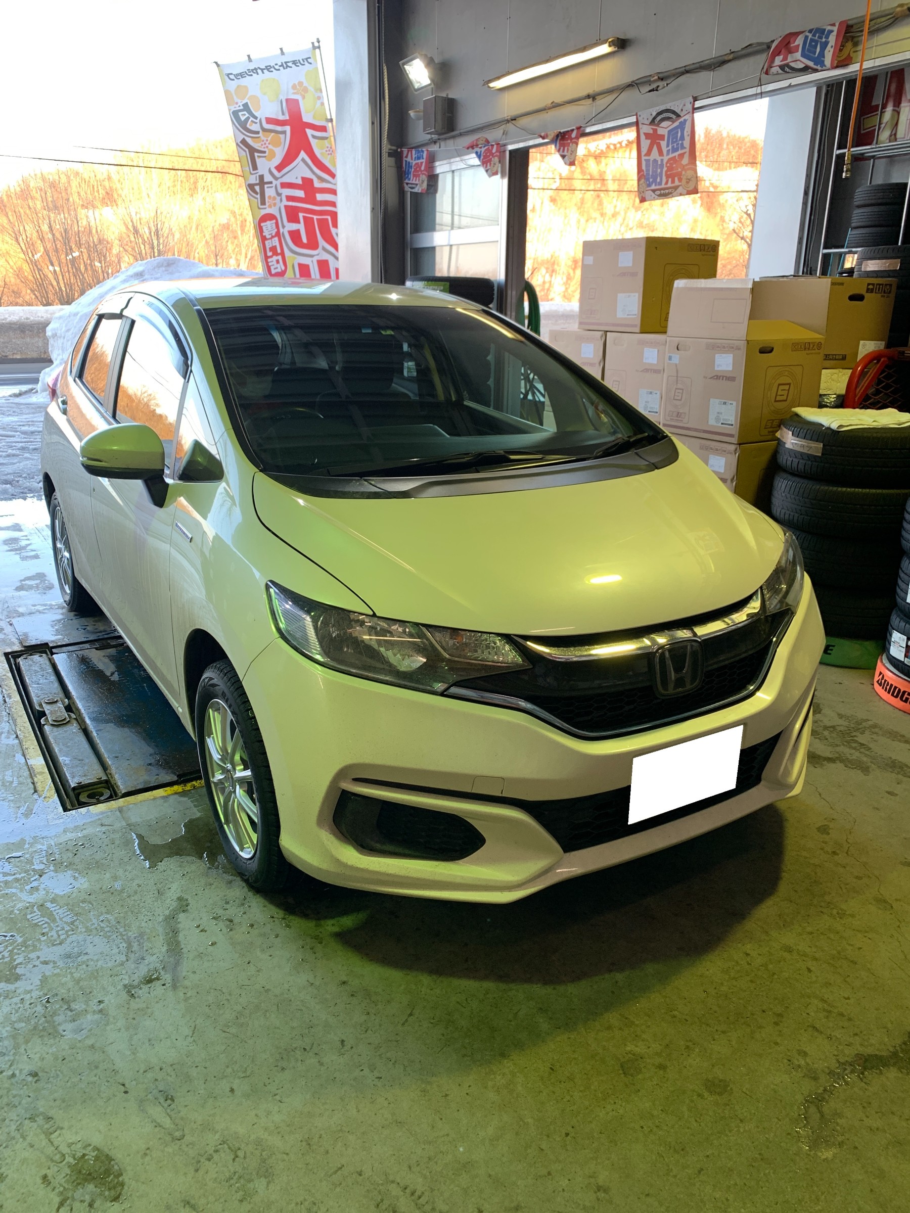 フィットのオーナー様もやはりマンホール部へ落下してしまい、タイヤバーストと歪みによりロードサービスで牽引されてきました。(写真は作業後です)