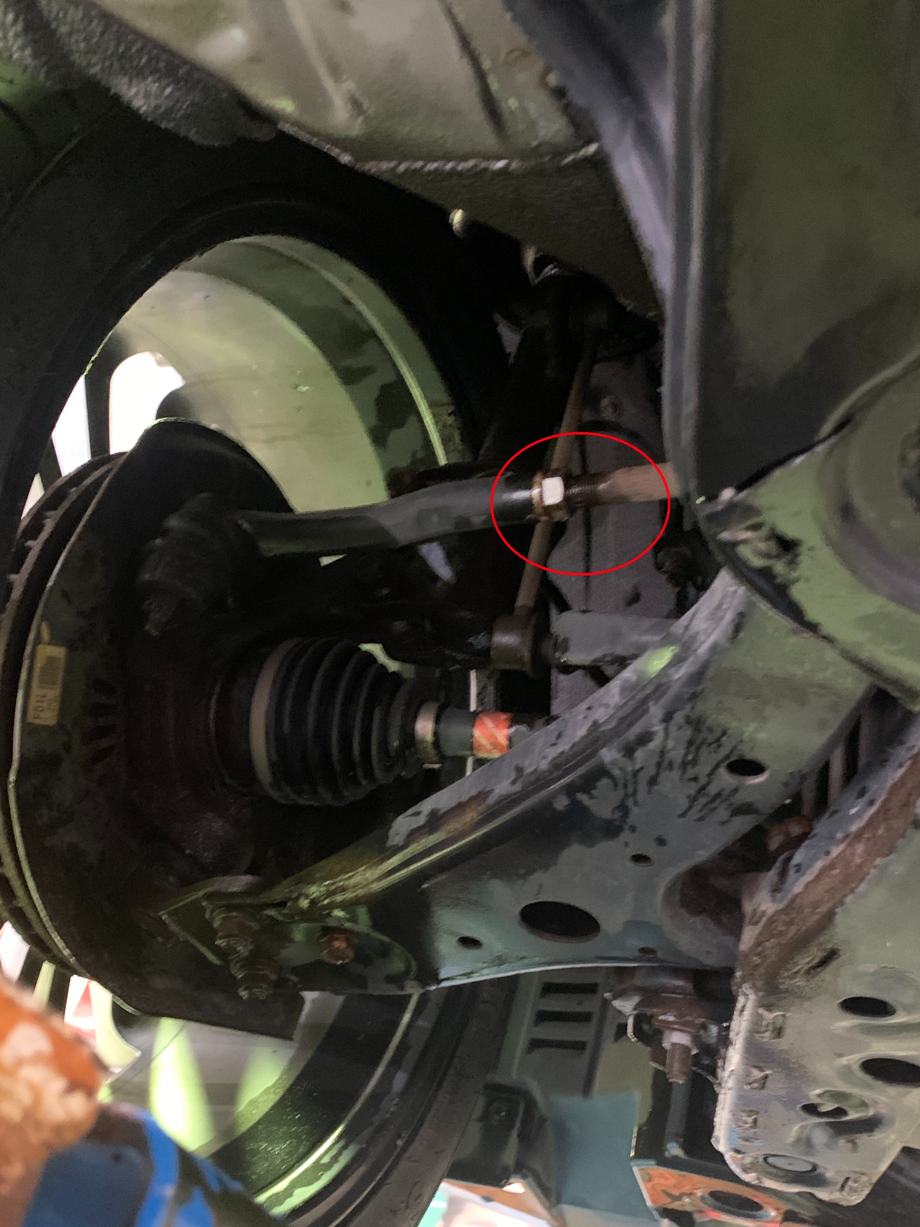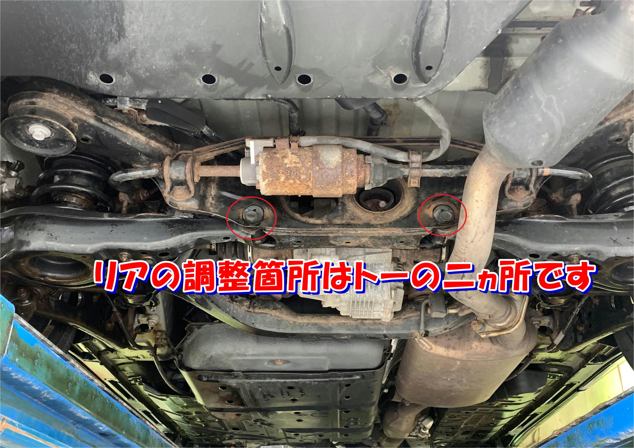 赤丸がフロントトーの調整機構。 調整前にネジ山の錆をしっかり落とし磨き、ラスペネ吹き付けてかじらないようにします。 これをやらない作業員が意外に多いのです。