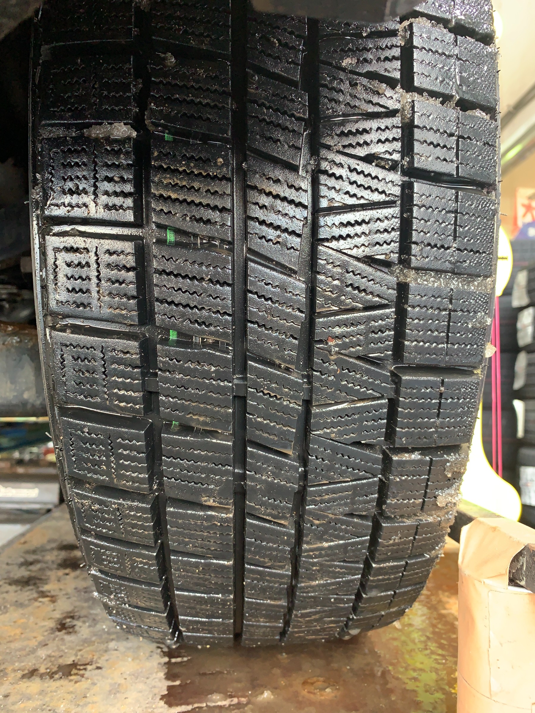 現物の夏用タイヤを確認したわけではないので確定的な事は言えませんが、スタッドレスタイヤの減り方を見ると右後ろの一本に不均一な減り方を確認出来ました。