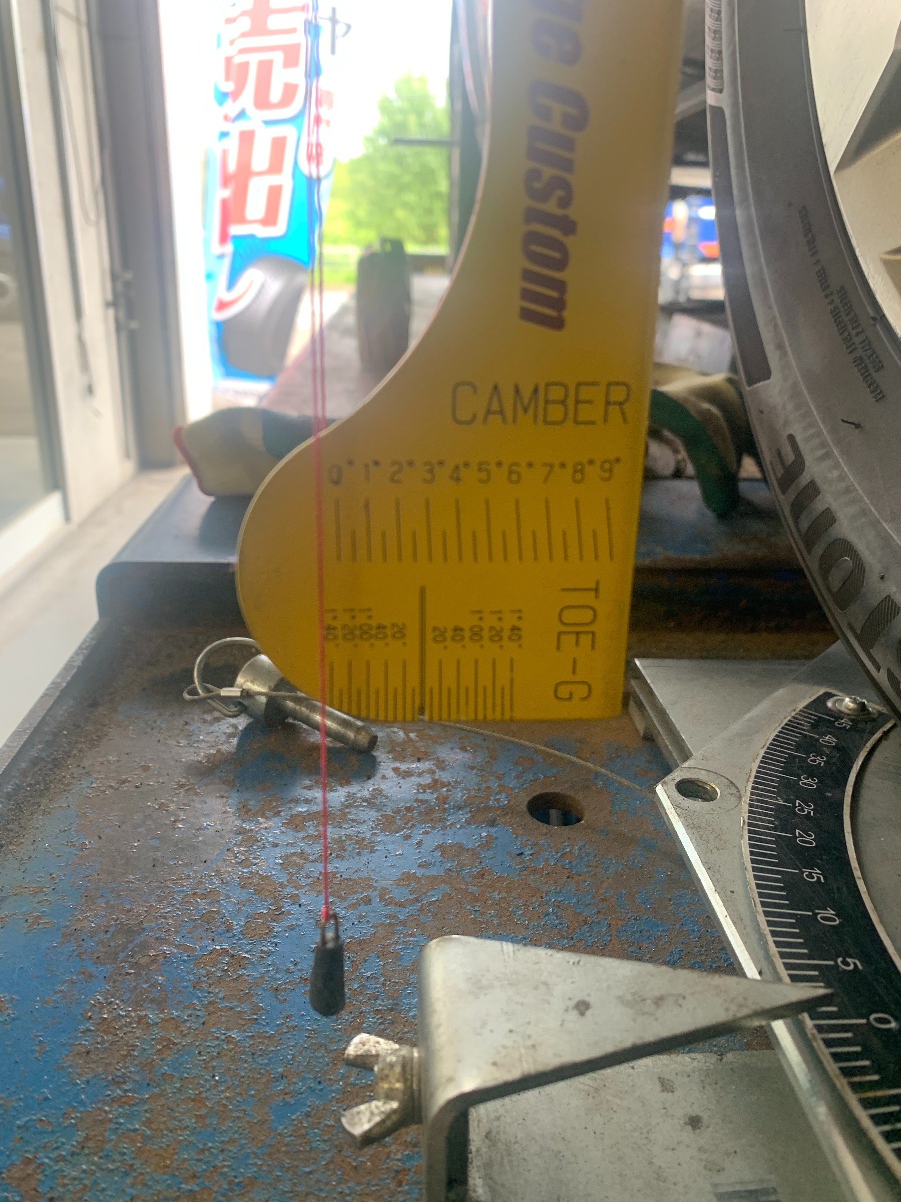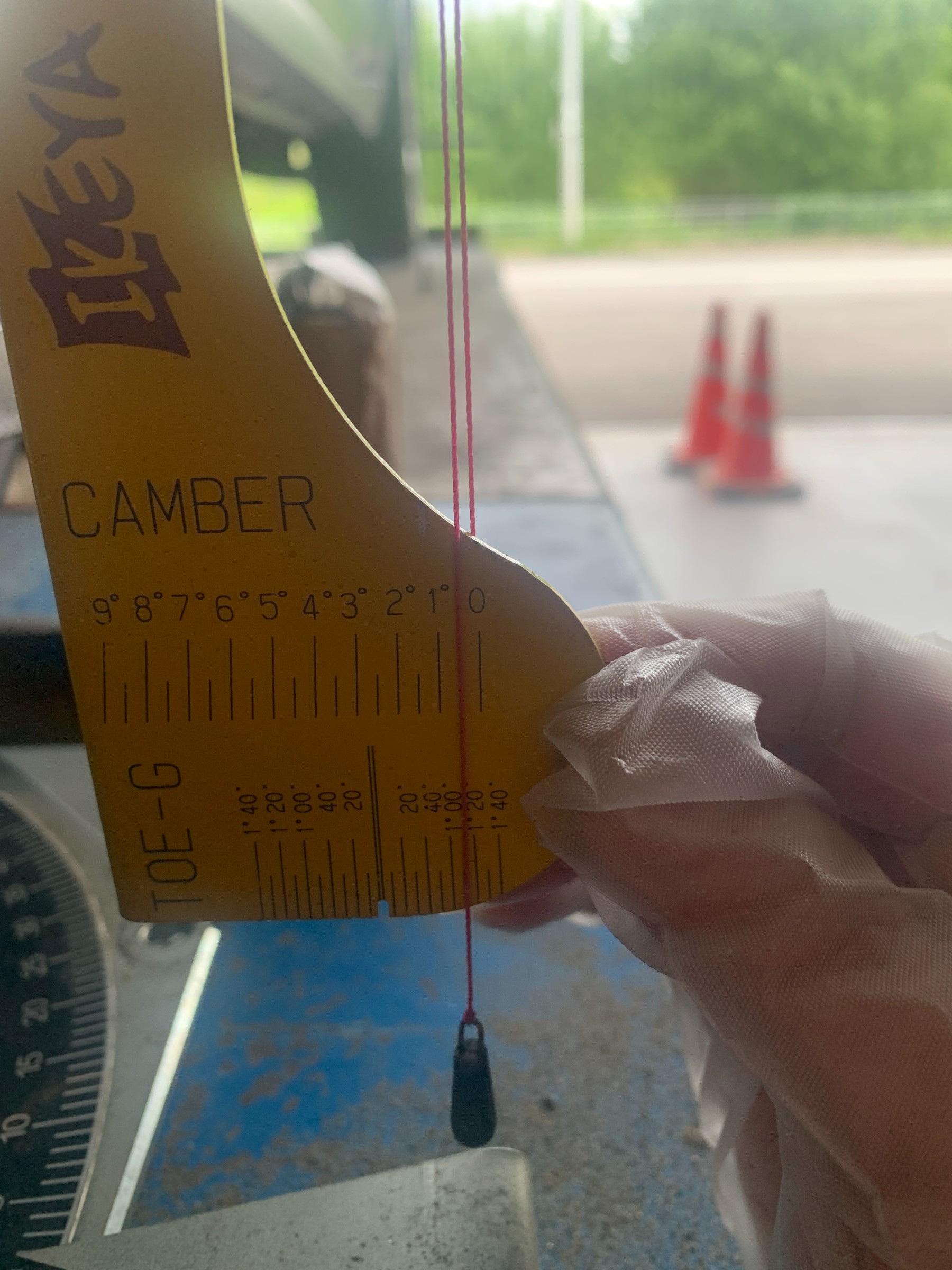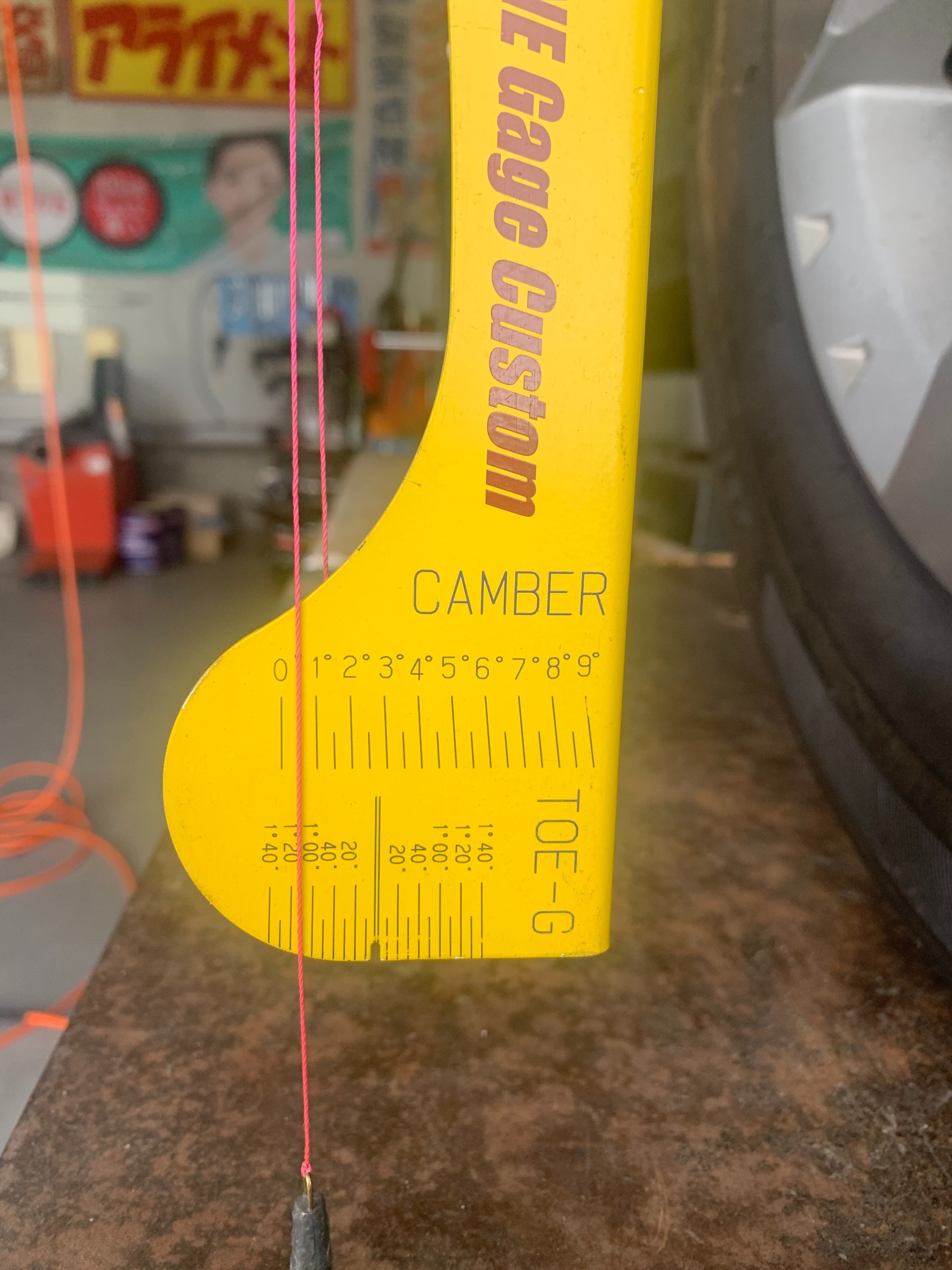 タイヤを外す→キャンバーボルト調整→タイヤ付ける→測定器具付け測定