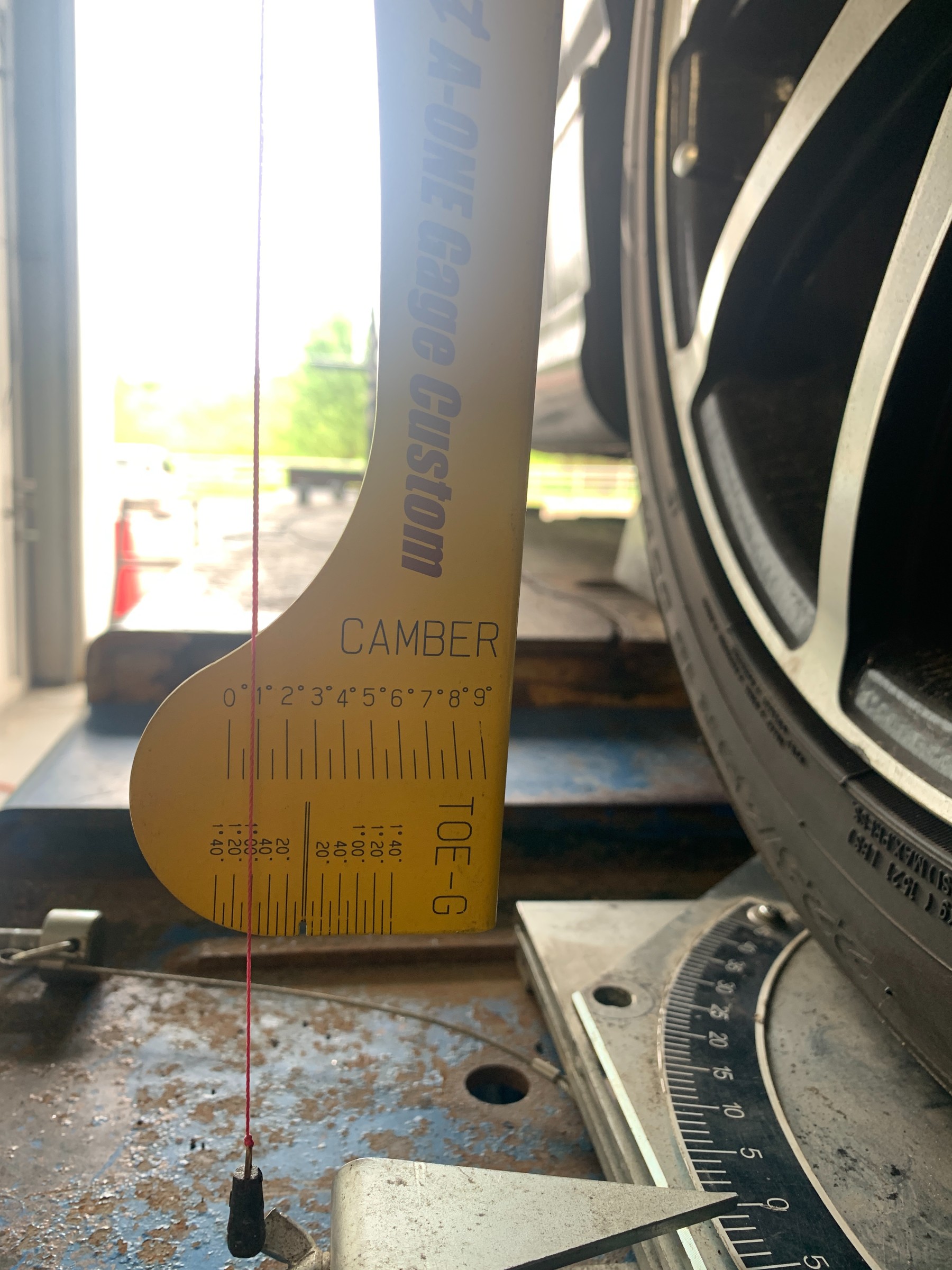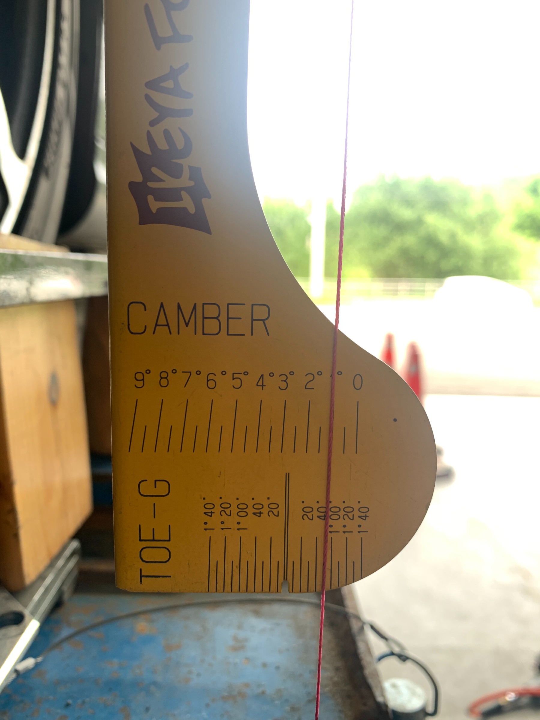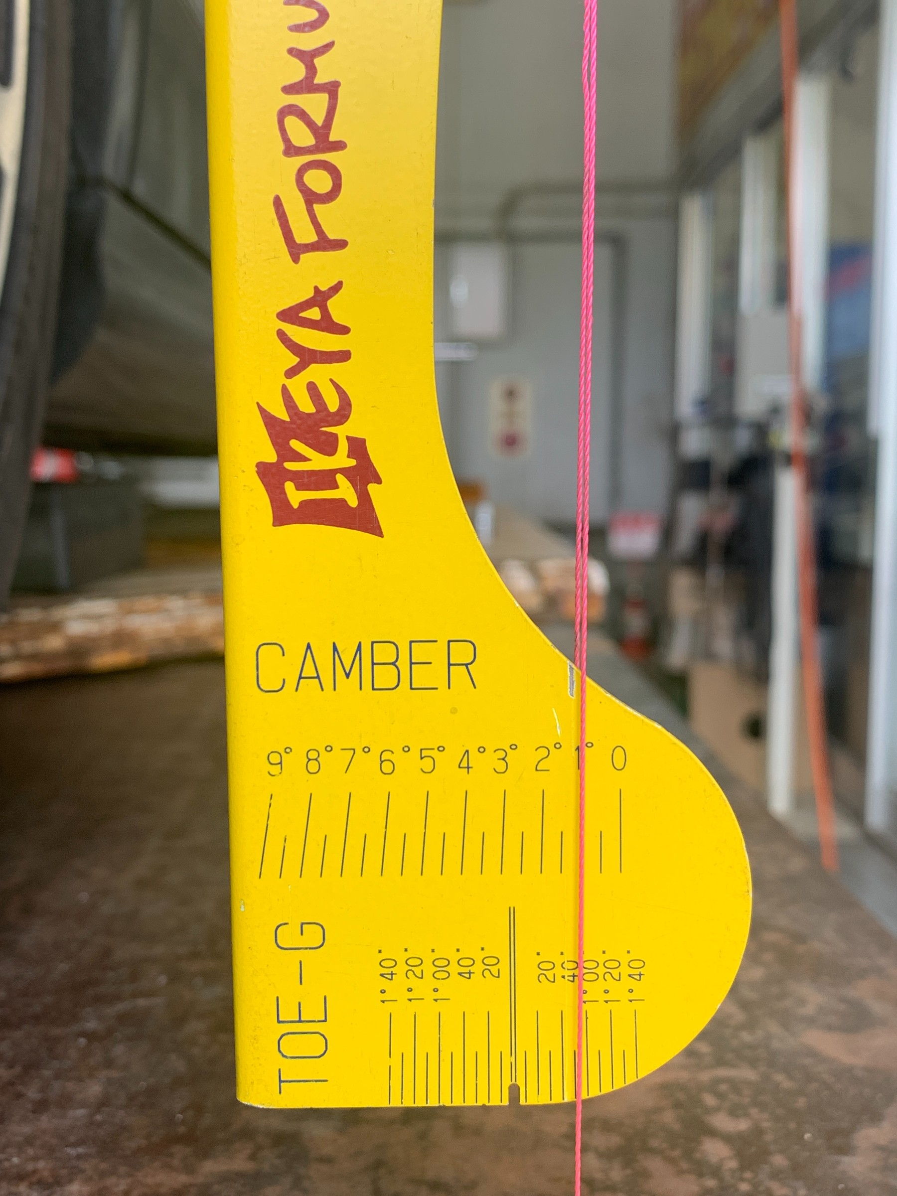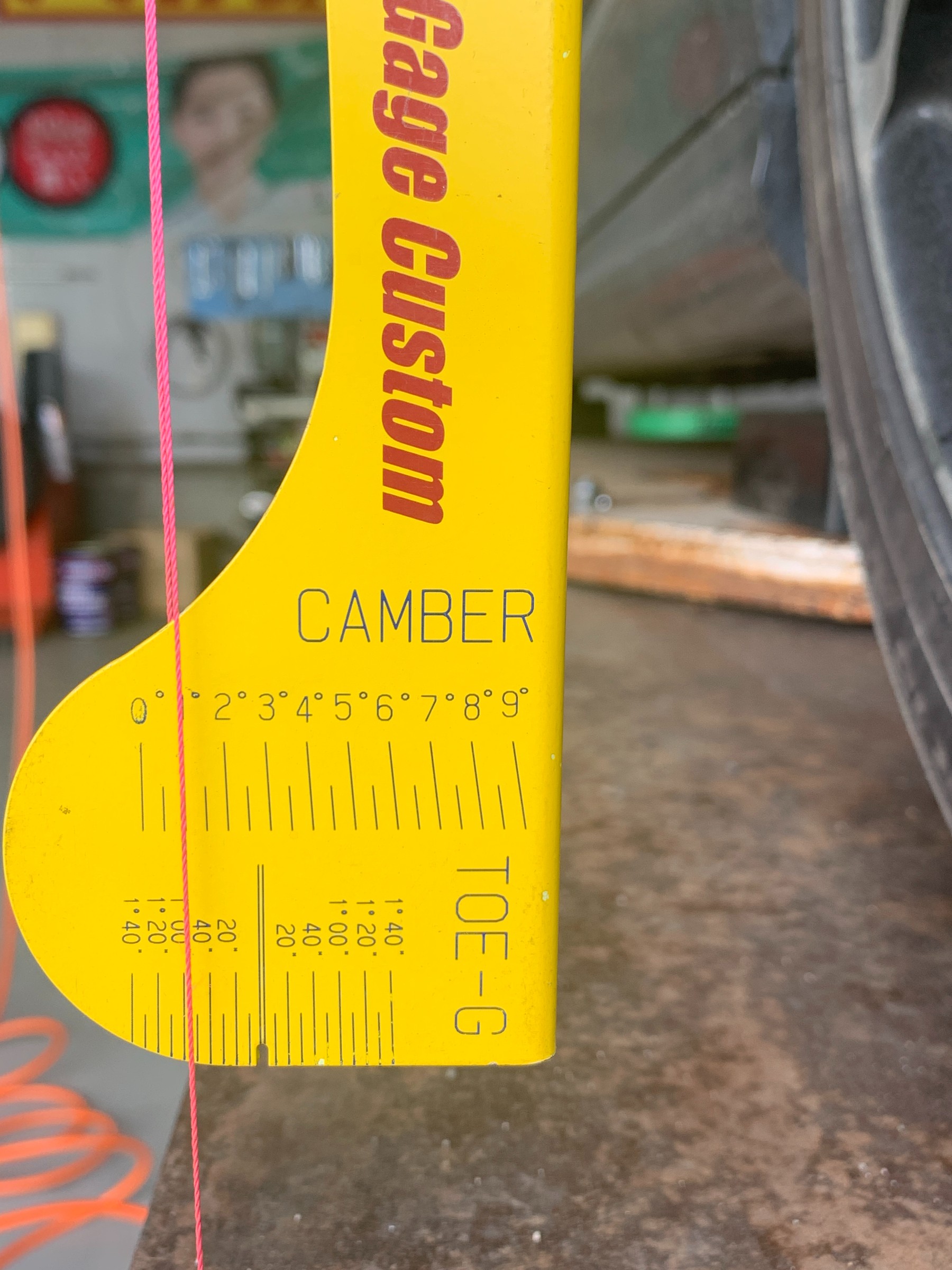 肝心なトー調整ですが、左後ろが調整に限界があり僅かにスラストがズレています。おそらく運転していて分からないレベルです。 もう少し車高を上げるとトーもバッチリ出来るかもしれません。