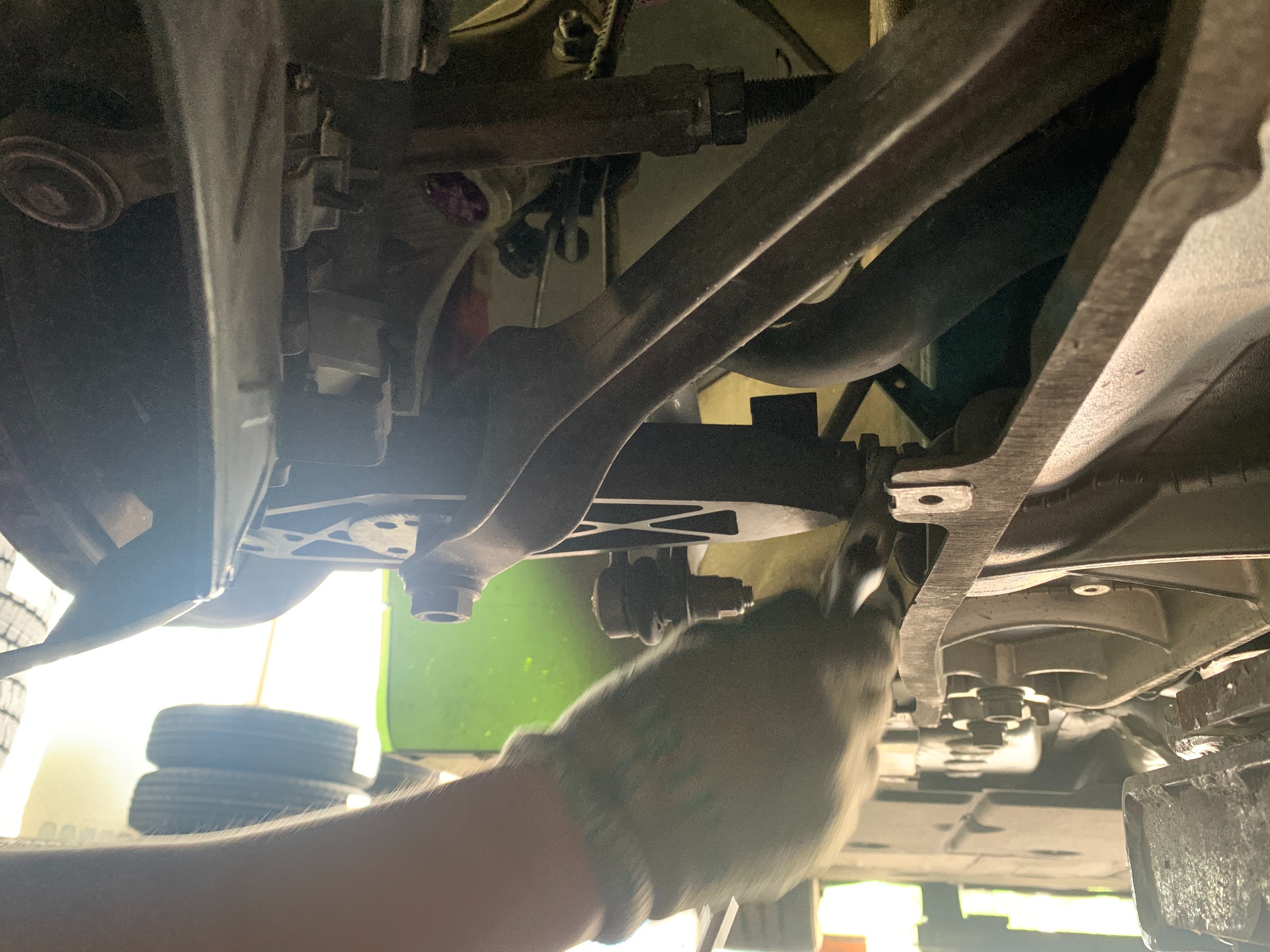 オーナー様はしっかり社外アームが入っていました。 入庫時は左右共に全縮み状態。