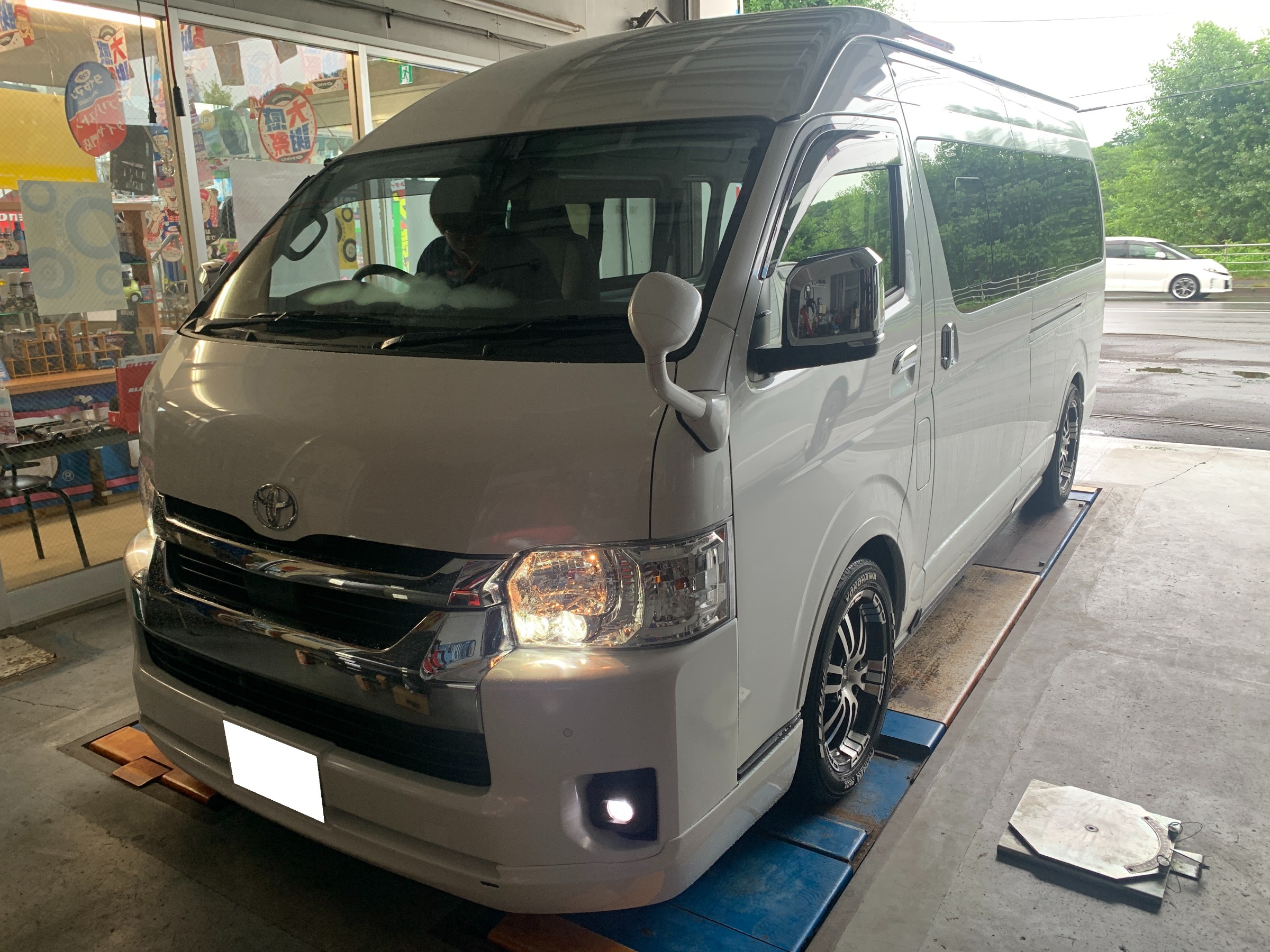 ワイドでロングでハイルーフ、走行距離140kmの新車ハイエースのアライメント調整です。