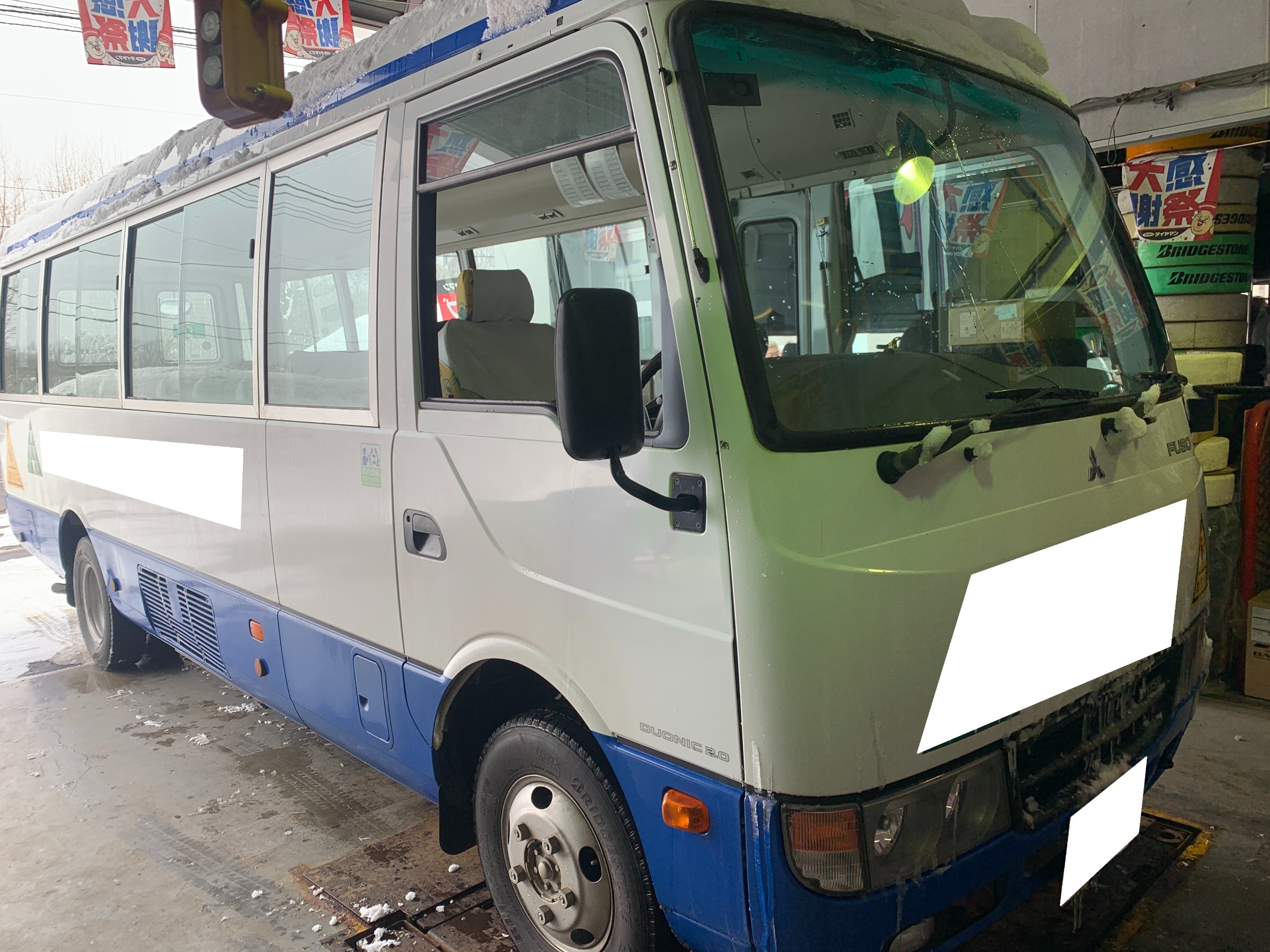 写真のマイクロバスも数年前に新車で入ってからずっと、当店でタイヤ/オイル交換もしています。