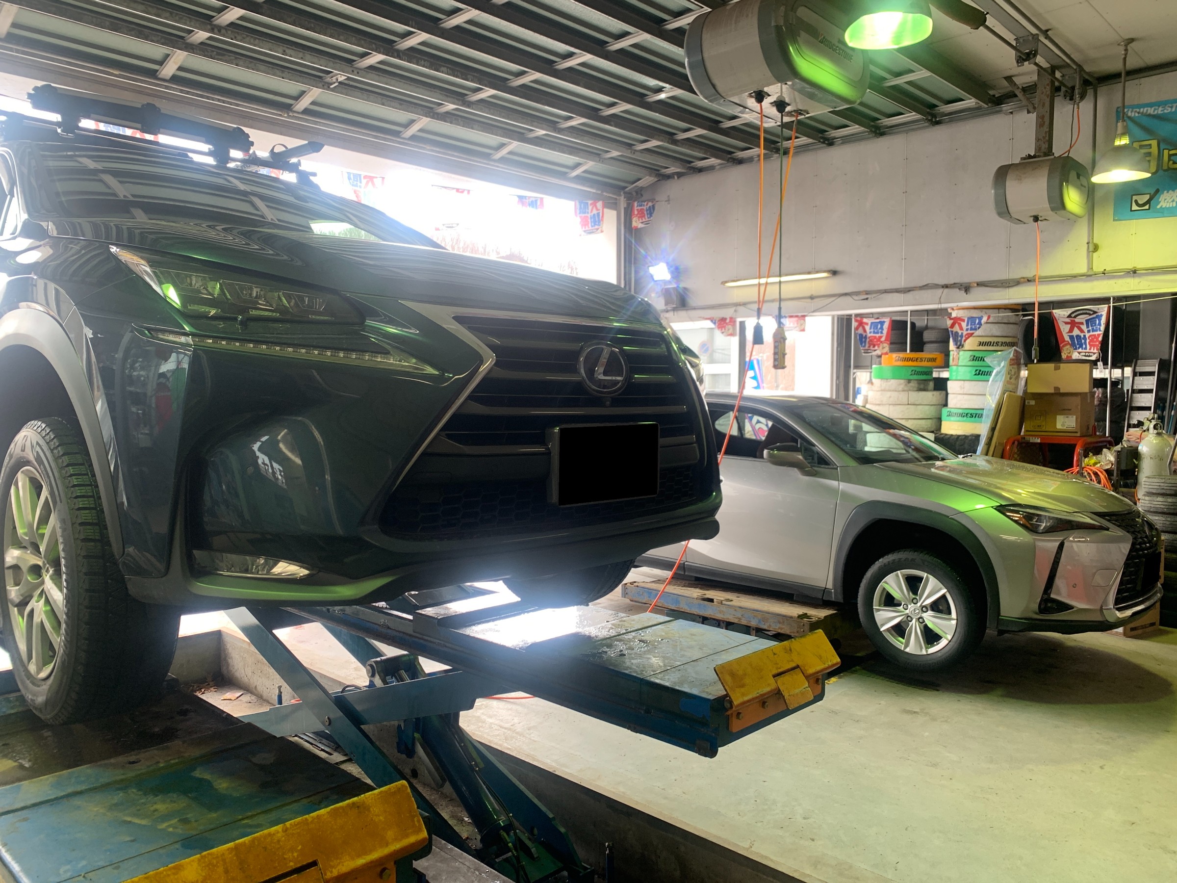 奥のUXはタイヤ履き替え、手前のNXは実は3月にアライメント調整で一度ご来店くださっているのですが、調整機構の劣化が著しくまともにアライメント調整が出来なかったので部品の交換です。