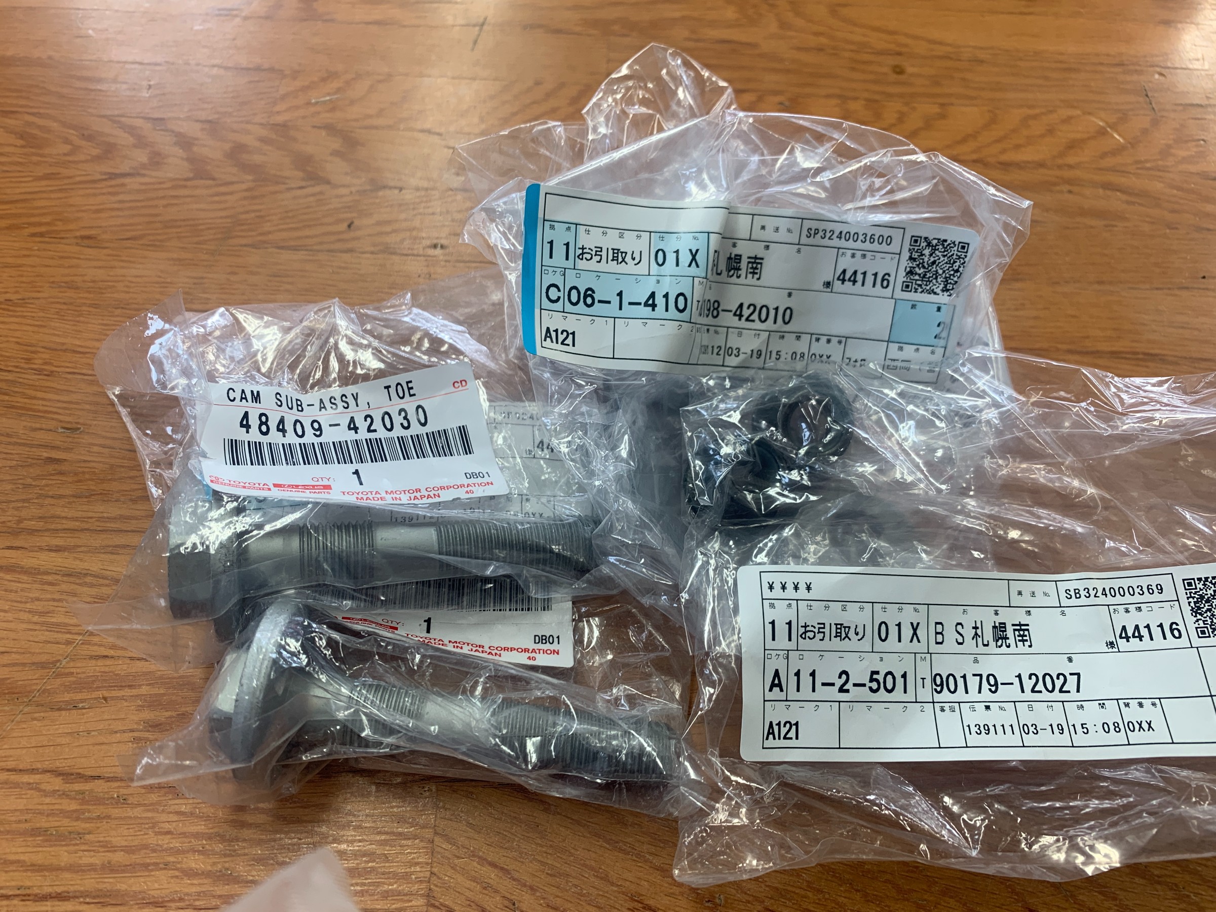 部品も用意し、いざ開始!だったのですが、トーのコントロールアームが尋常ではないほどの固着により外すことが不可能、仮に外せたとしても再利用は出来ないものと考え追加でそこも新品に交換することになったのでこの日は作業中止。 近日中にトライする予定です( ノД`) (4/8無事終了しました。)