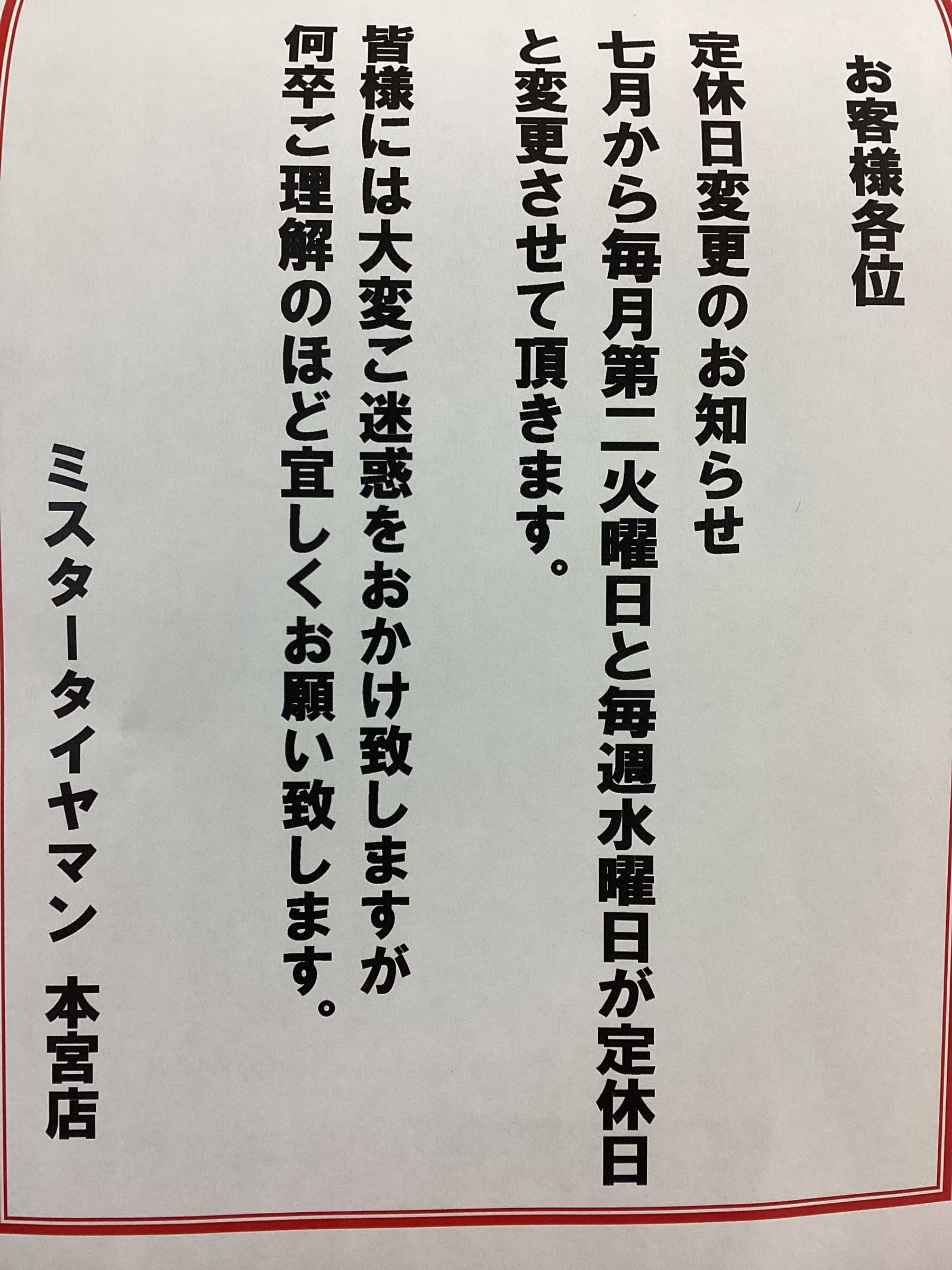 今回は定休日変更のお知らせです
