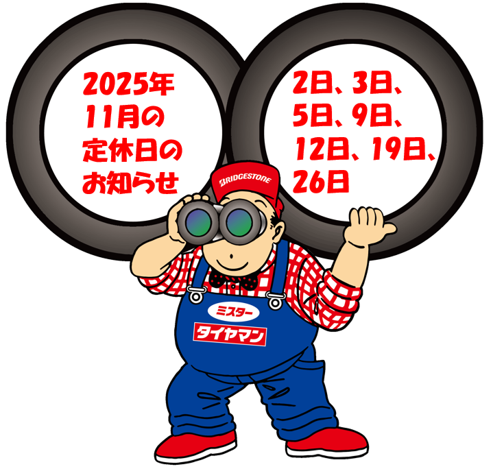 2025年11月休業日のお知らせ 2025年11月5日 いつもお世話になっております。 ミスタータイヤマン村上店です。 誠に勝手ながら、11月2日(日)、3日(日)、5日(水)、 12日(水)、19日(水)、26日(水)を 休業とさせていただきます 日頃よりご利用いただいておられるお客様には 大変ご迷惑をお掛け致しますが、何卒ご理解、 ご容赦の程よろしくお願い申し上げます