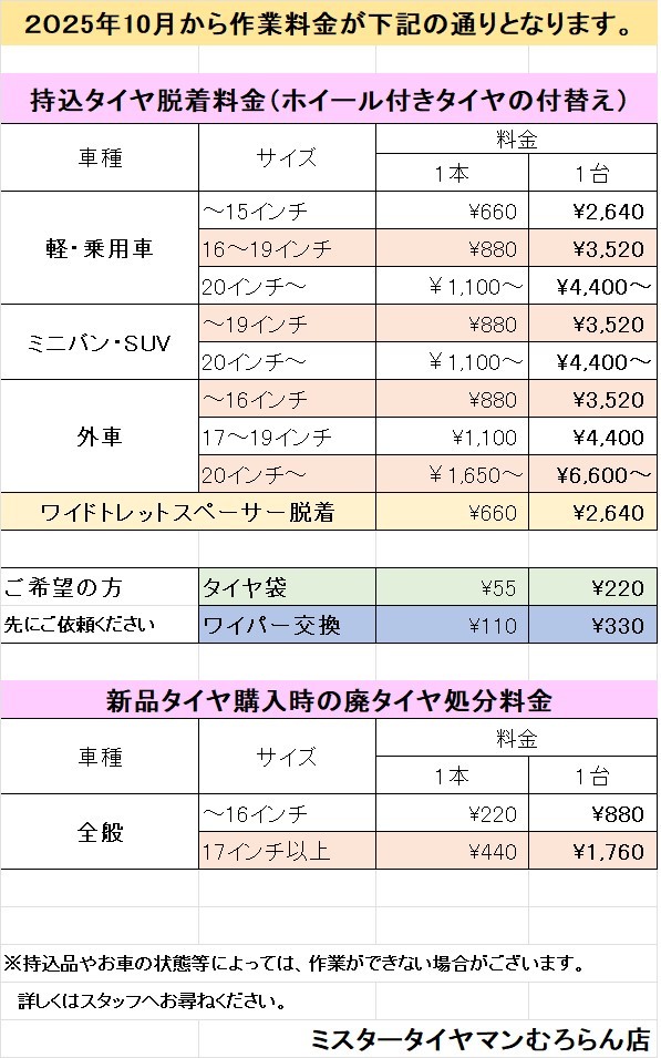 さて、この度、近年の店舗の設備や公共料金等の費用の高騰により、現在行っているサービスを維持させる事が、年々厳しい状況となっております。つきましては、持ち込みのタイヤ脱着作業料金を10月より下の表の通り改定させて頂きます。また今後とも、スタッフ一同更なる安全とサービスの向上に努めてまいります。