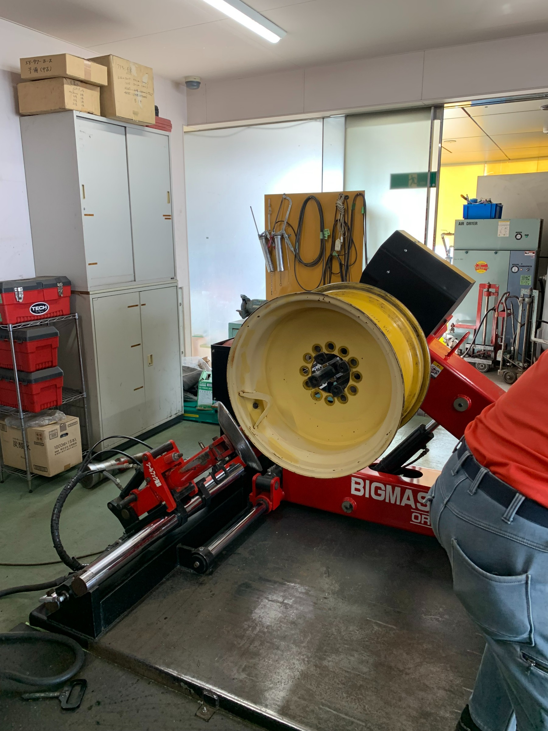 こんな大きなタイヤを乗用車のタイヤの様に組替していく所は