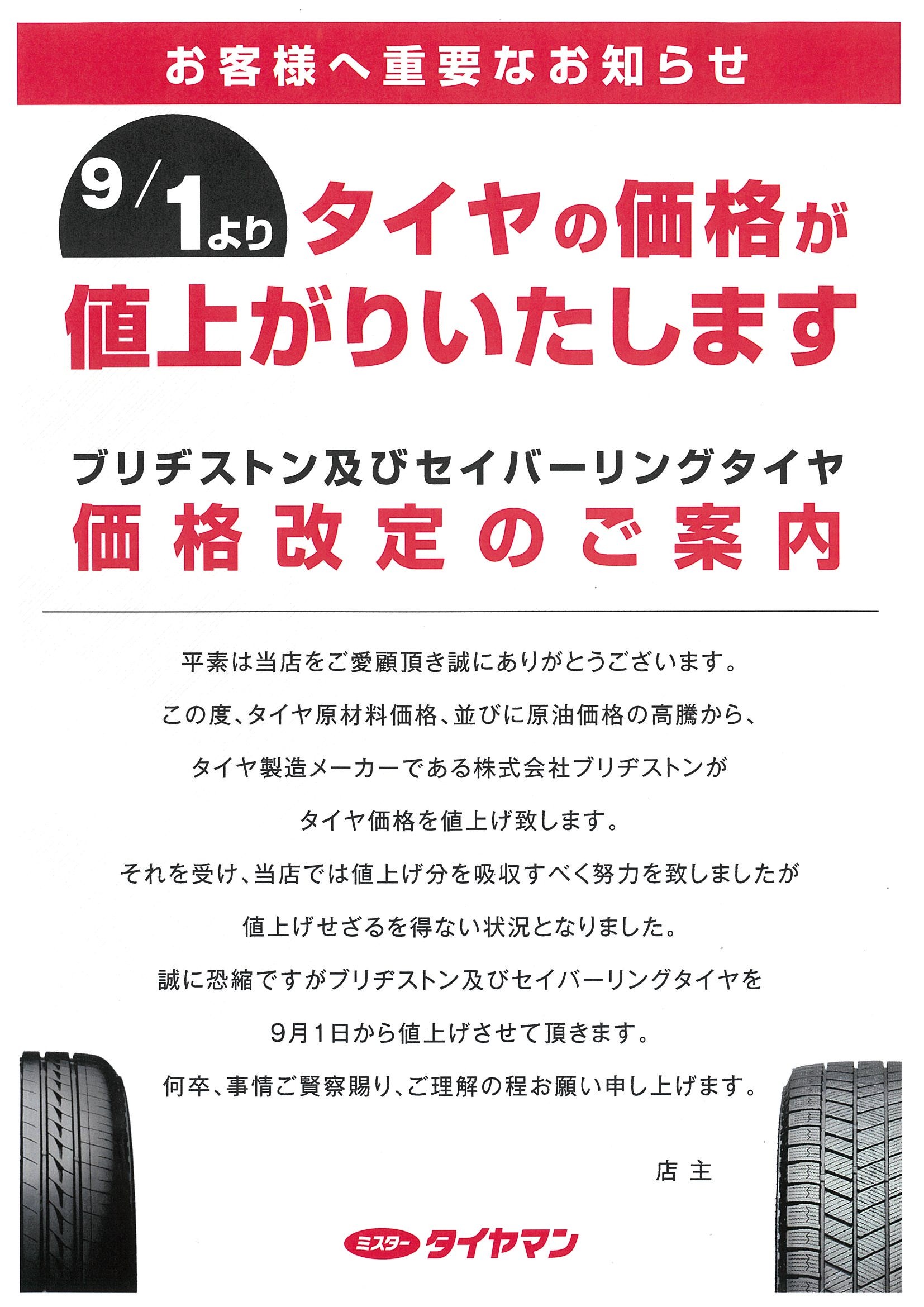 2022年9月より ブリヂストン及びセイバーリングタイヤの価格が値上がりします。