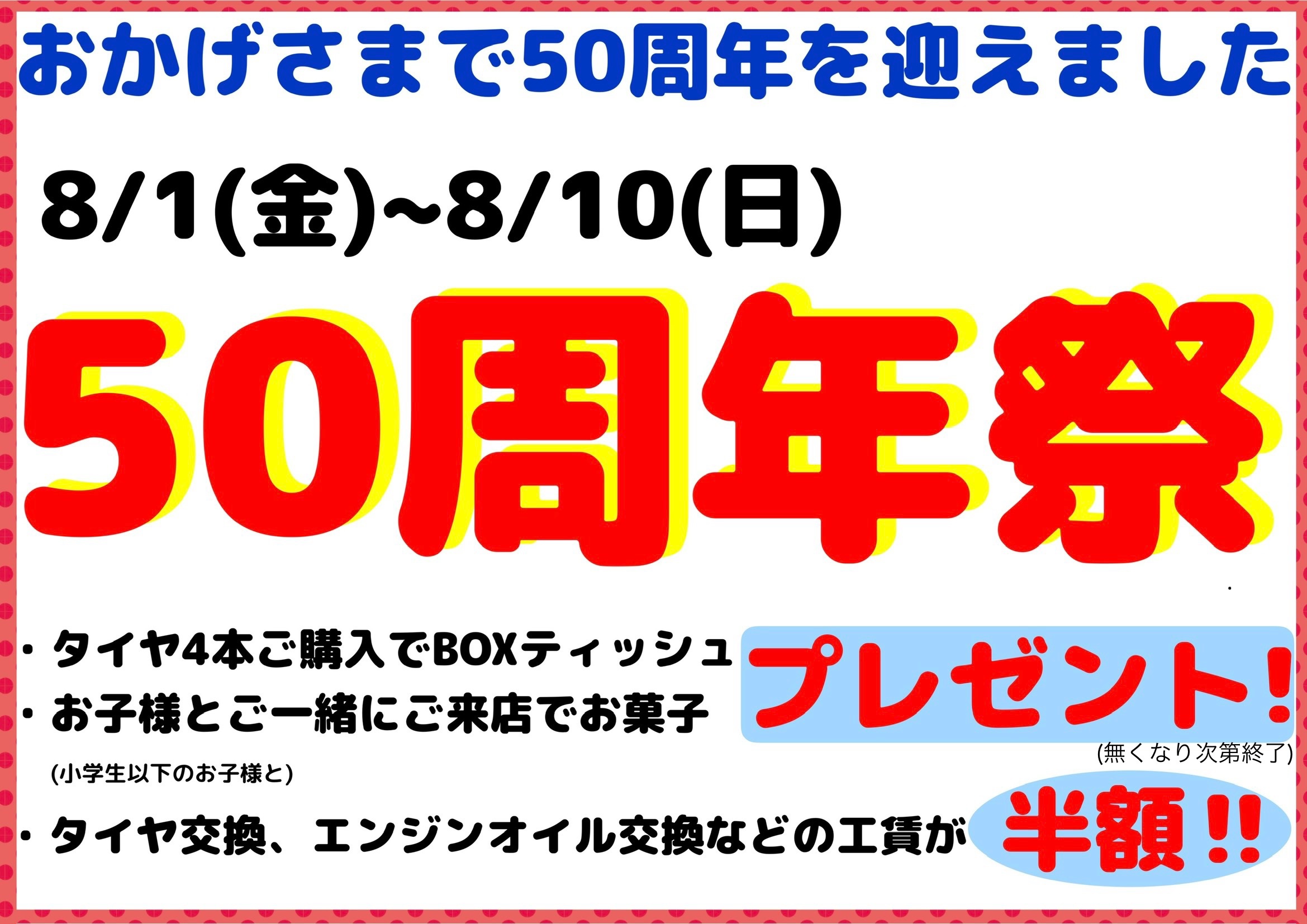 ミスタータイヤマンナカザワ ”50周年祭” を開催します! 2025年7月26日 おかげさまで当店は50周年を迎えることができました。 そこで日頃の感謝も込めまして『50周年祭』を開催いたします(^。^) 期間 8月1日(金)~10日(日) スタッフ一同心よりお待ちしております!