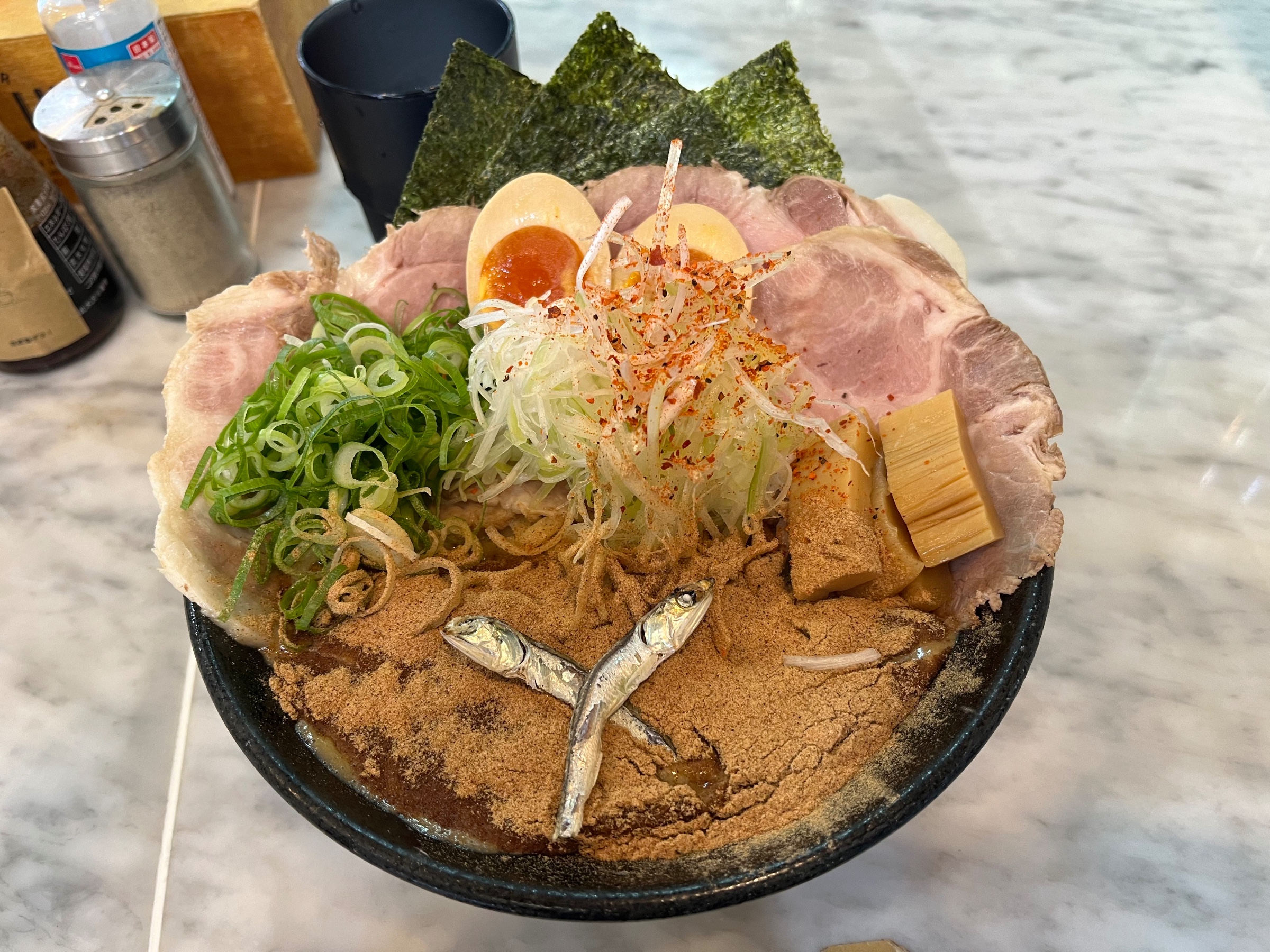 ドロドロ鶏白湯スープの上に、これでもかっ!とっ言うくらいの大量魚粉が乗っており、逆にこの量だからこそ鶏と魚の旨みのバランスが取れていると思う!とても旨しψ(`∇´)ψ