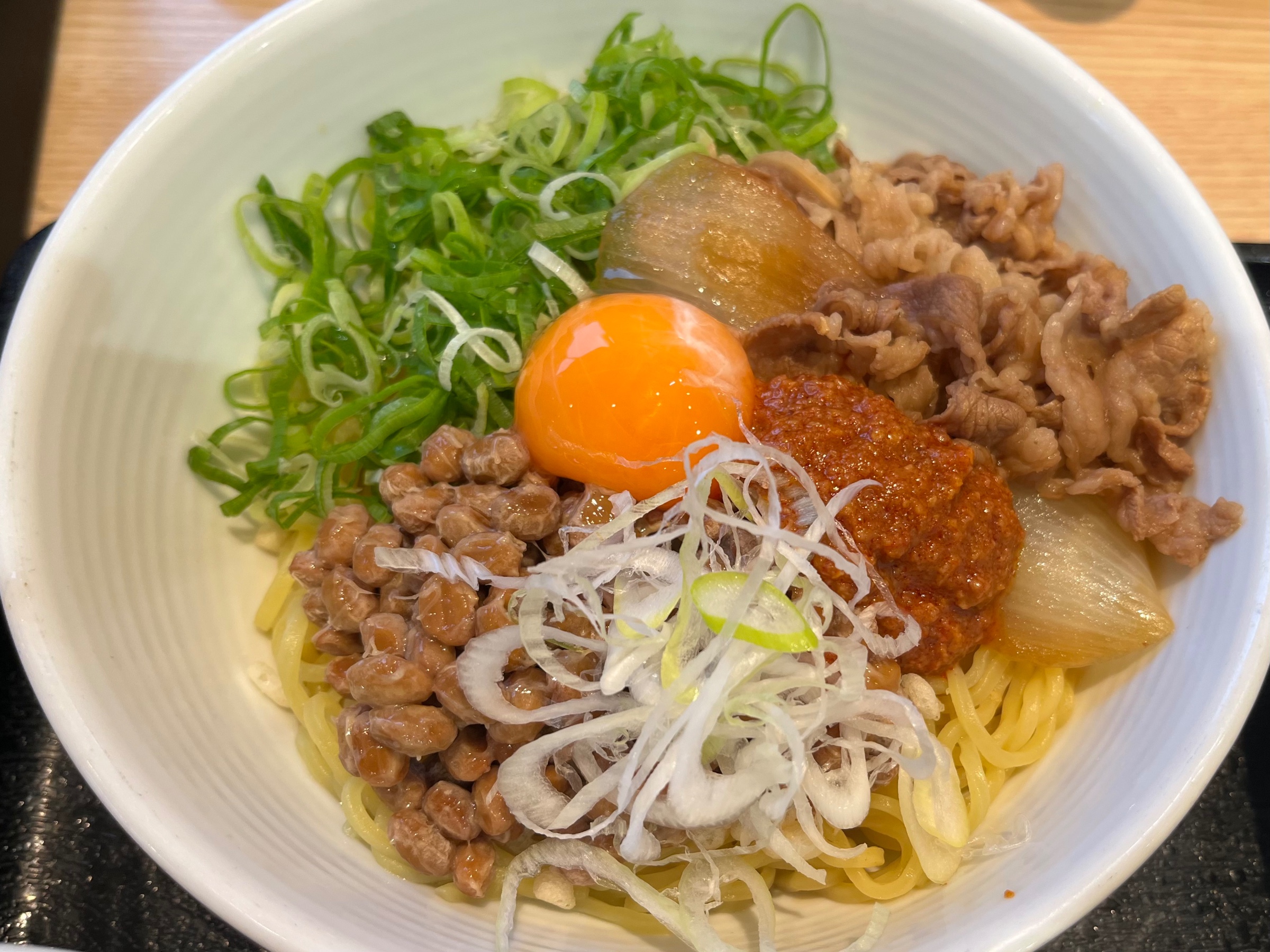 TVCMやSNS等で話題となっていました吉野家の『牛玉スタミナまぜそば』を納豆トッピングで先日頂きました♪(´ε` )