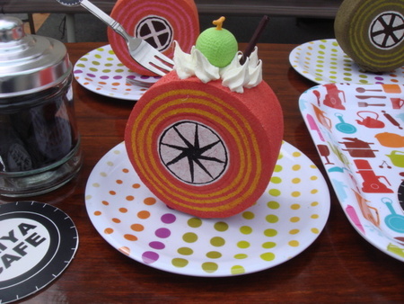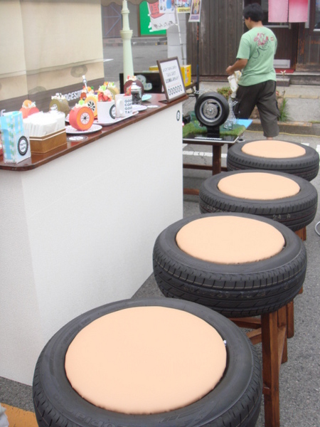 本物のタイヤを使った椅子や、発泡スチロールで作ったロールケーキなど☆