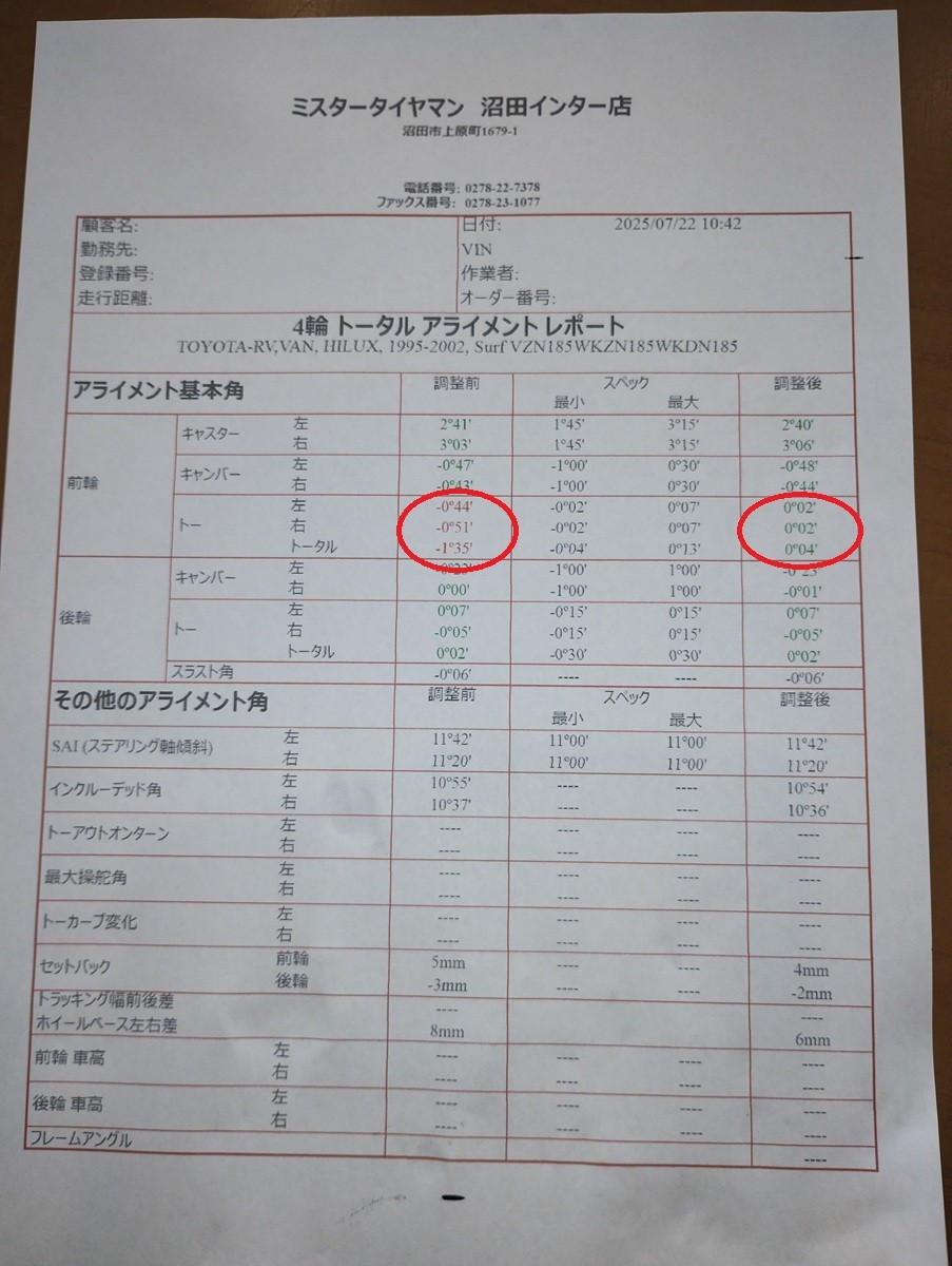 2025年7月28日トヨタ ハイラックス サーフ その他 タイヤ・ホイール関連 > アライメント調整