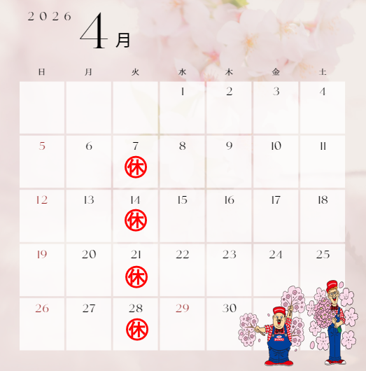 ㊡4月のお休み㊡ 2026年3月25日 いつもミスタータイヤマンおだわら店を ご利用いただきありがとうございます! 4/5(日)まで春の感謝祭開催してます♪ \3月のお休みのお知らせです/ OPEN 9:00-18:00(最終受付17:30) 定休日:毎週火曜日 宜しくお願いします。
