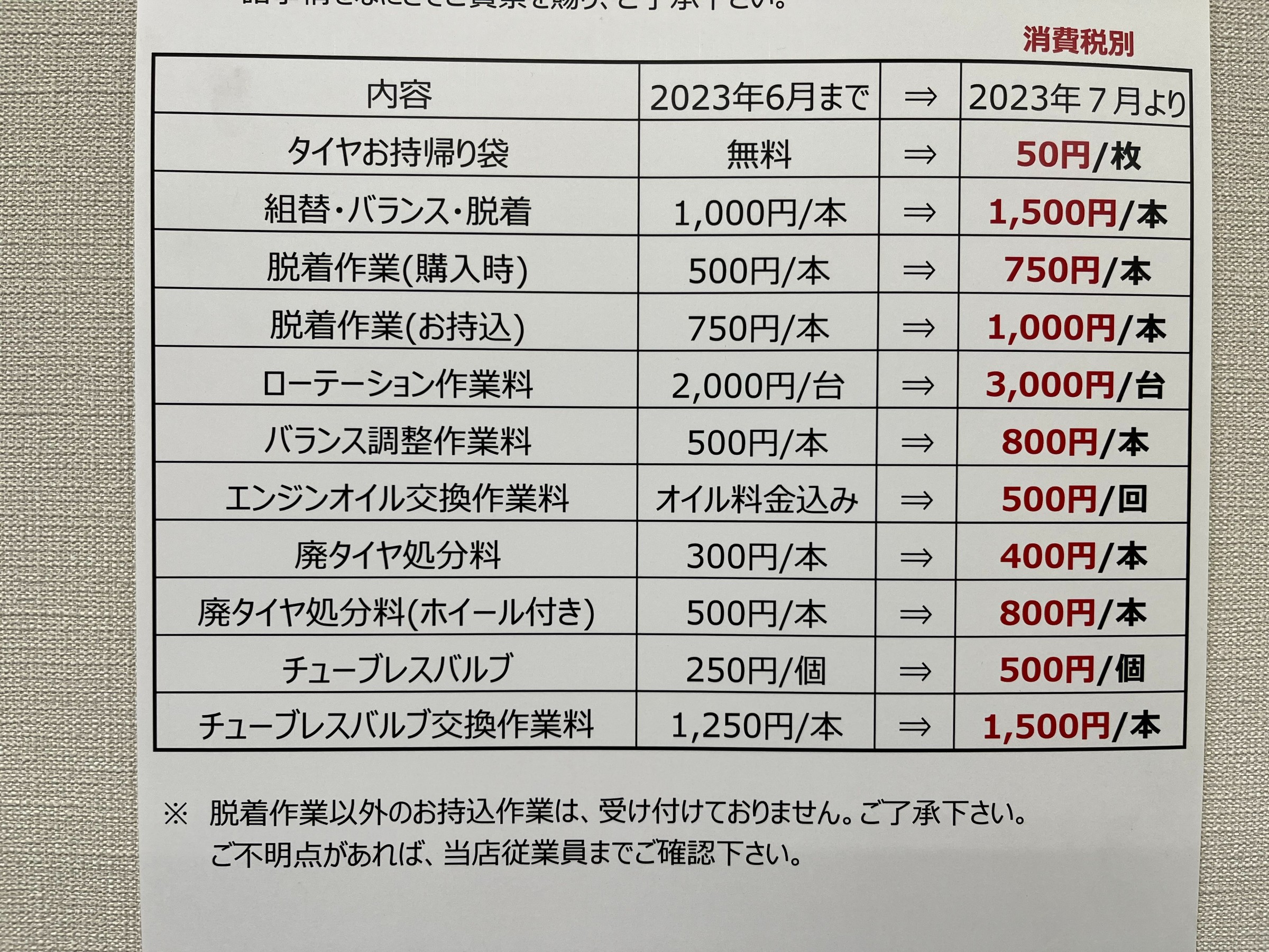 価格改定のご案内 2023年6月18日 いつも当店をご利用頂き、誠にありがとうございます。 2023年7月1日より、一部の商品、作業料金の価格改定をさせていただきます。 原材料のプラスチックの地球環境対策及び価格高騰を踏まえ、 タイヤお持ち帰り時に使用の「タイヤお持ち帰り袋」の有償化 作業時に使用の電気料金の値上げに伴い、作業料金等の価格改定 運搬コスト、処理料金の高騰により、廃タイヤ処分料金の価格改定 諸事情をなにとぞご賢察を賜り、ご了承下さい。