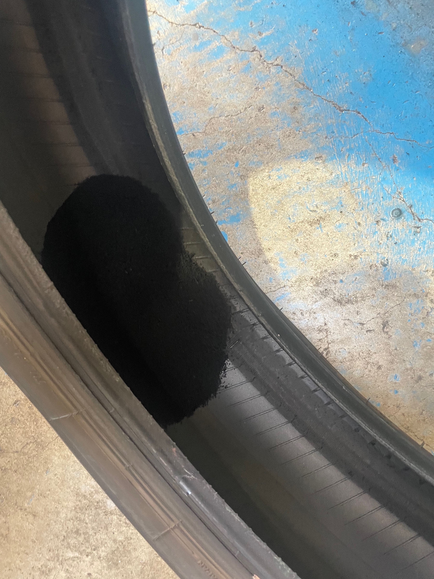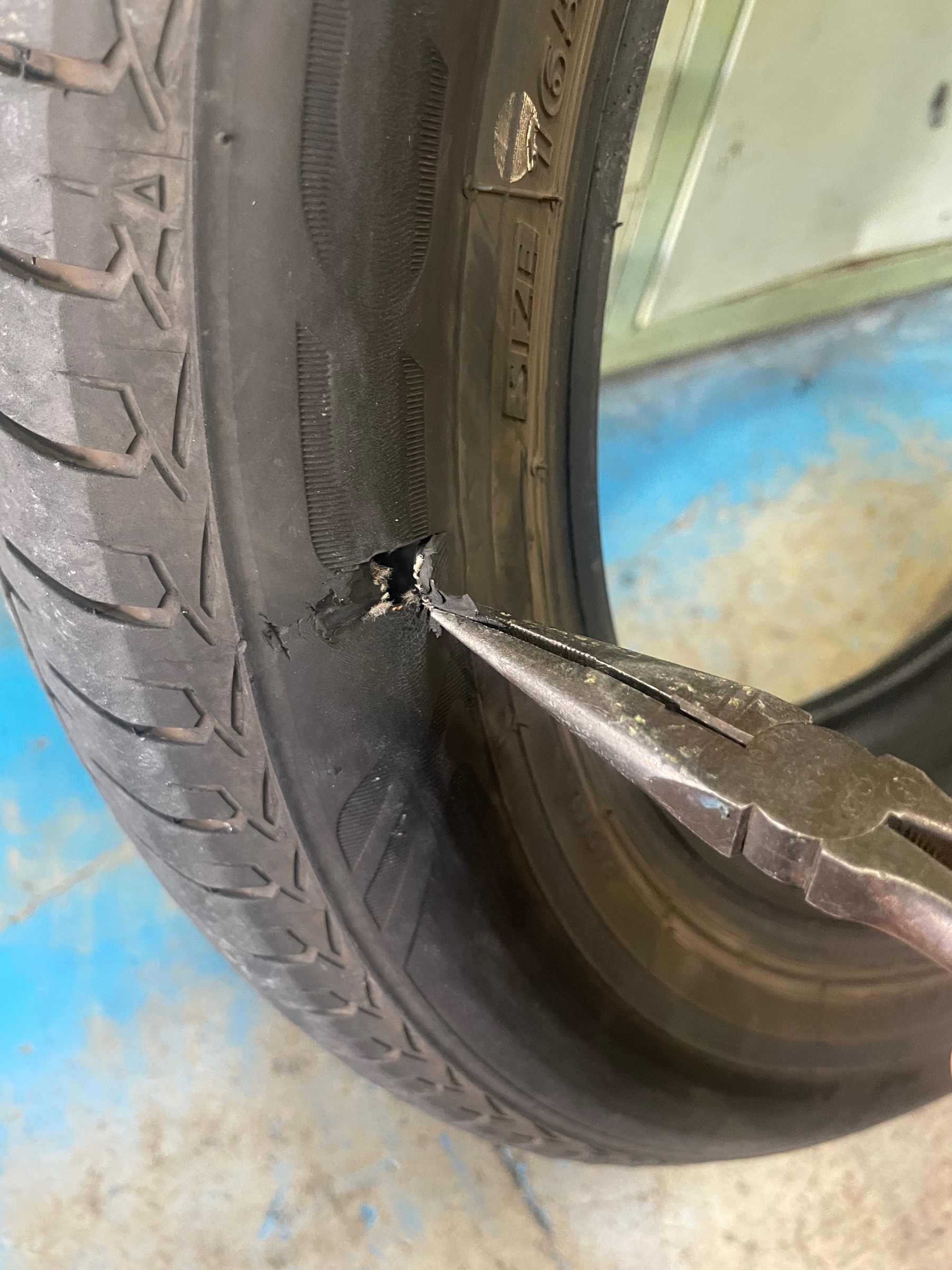 タイヤを確認すると、タイヤの側面に穴が開いています(ノД`)・゜・。