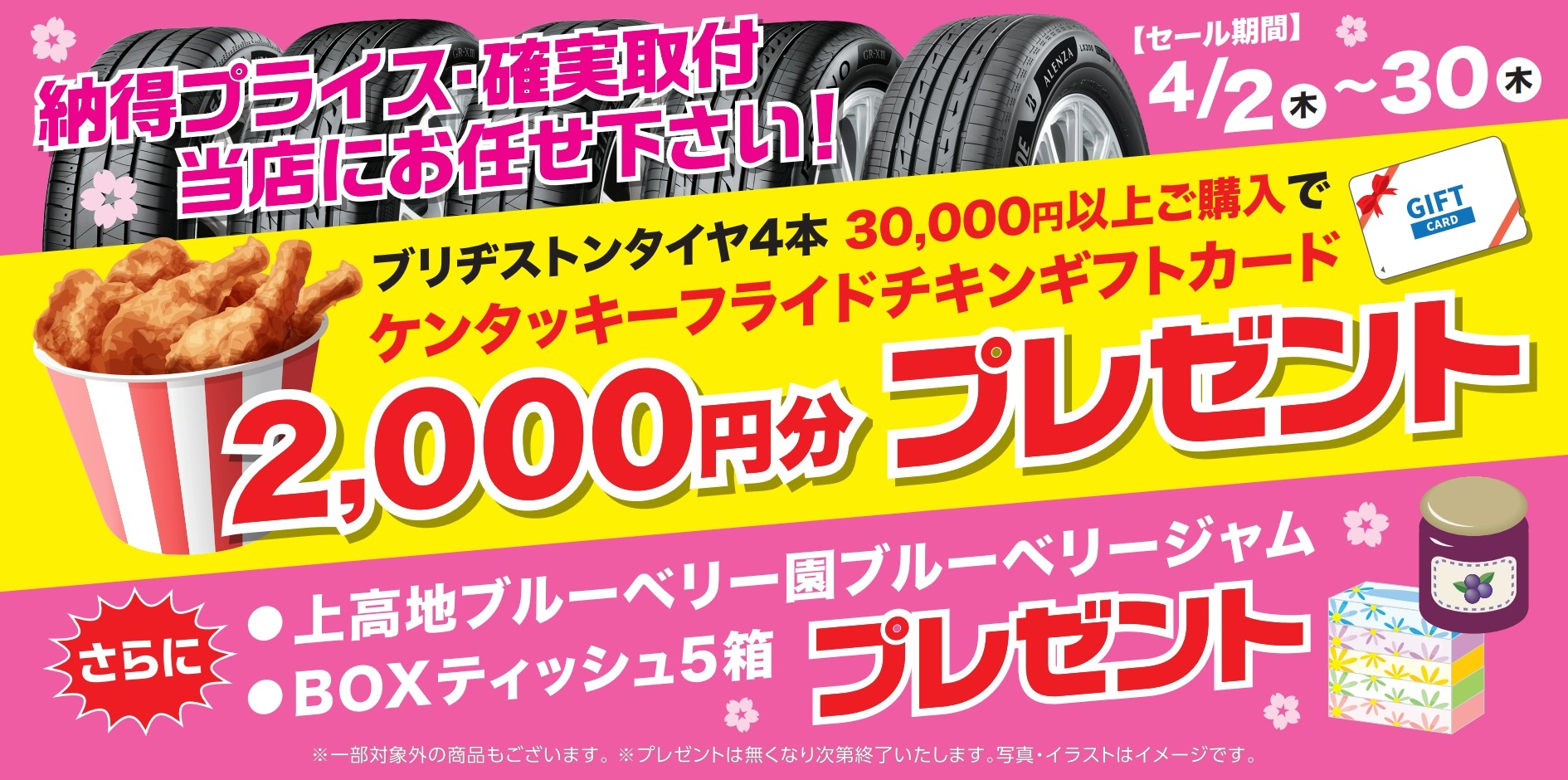 春のケンタッキーフェア開催のお知らせ 2026年3月25日 春のケンタッキーフェア開催のお知らせです! 期間中、ブリヂストンのタイヤを 4本、30,000円以上ご購入で、 ケンタッキーフライドチキンの ギフトカードをプレゼント!! 開催期間 4月2日(木)~4月30日(木) そのほかにも、 お得な特典がありますので、 ぜひ、この機会にご来店ください!! 詳細は、 画像のチラシをご覧ください! ※一部対象外の商品もございます。 ※プレゼントは無くなり次第終了となります。