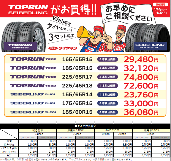WEB限定タイヤ TOPRUN・セイバーリングがお買い得!! 2026年4月9日 みなさんこんにちは! 当店のホームページをご覧いただきありがとうございます。 ホームページをご覧になったお客さま限定で、 お求めやすい価格帯のタイヤをご提供いたします。 各サイズ3セット限定となります。 別途、作業工賃がかかります。