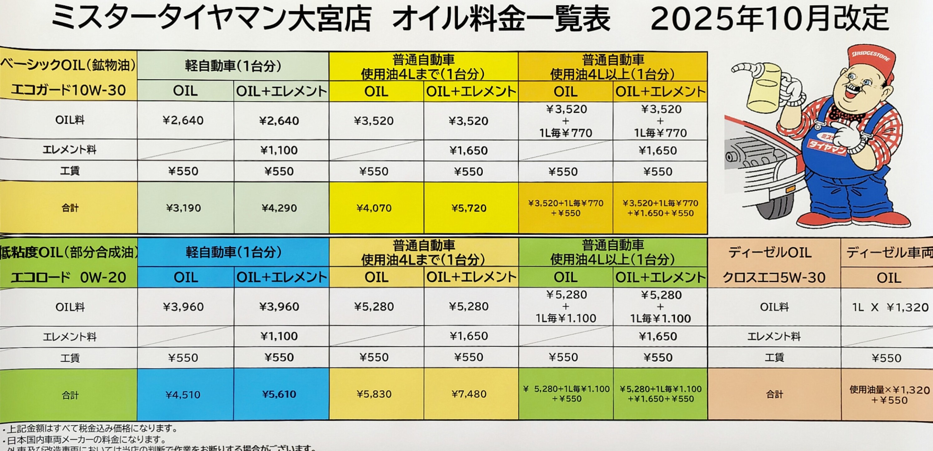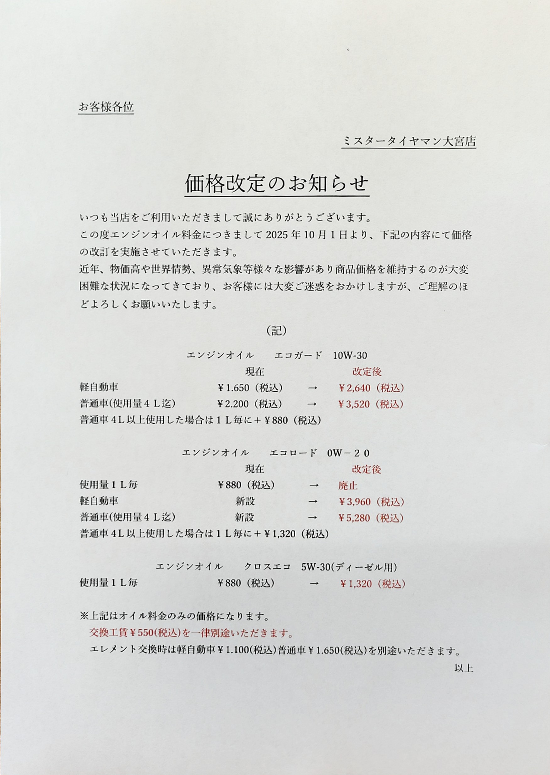 価格改定 2025年9月21日 お客様には日頃よりご愛顧いただき、誠にありがとうございます。 この度、諸般の事情により2025年10月1日から『油脂類』および『作業工賃』の価格改定をさせていただくことになりました。 何卒ご理解いただきますよう、お願い申し上げます。