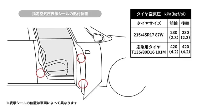 スタンドなどでご自身で補充される時、空気圧をどのくらい補充したらいいのか分からない場合はドア表示を参考にしてくださいね。(下図は一例です。ドア表示の数値をご確認ください)