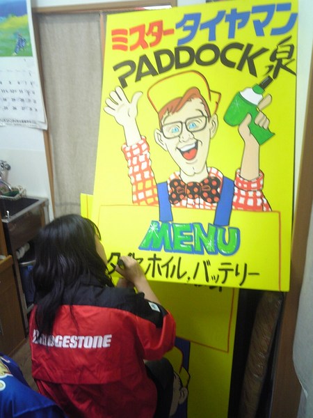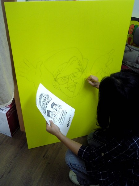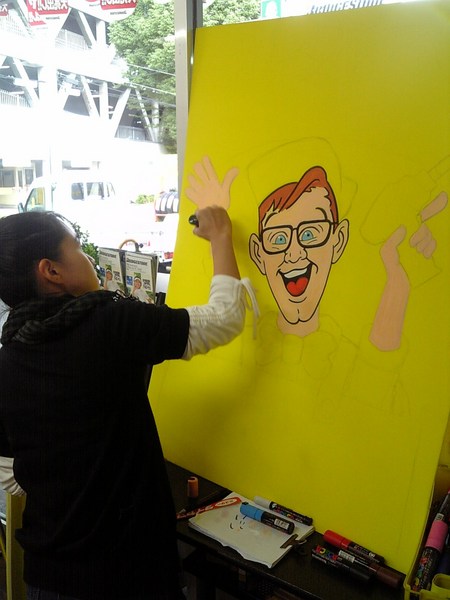 まずは、黄色いPOPボードに下書きの鉛筆画にとりかかられました、あらかたのデッサンがお済みになられたら次に輪郭の整理その後、ペイントへと筆をすすめられていかれるさまを御覧ください。