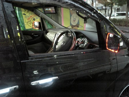 時間にして約二時間ぐらいの作業でした。結構ドアの間のゴム管の中に配線を通すのに苦労しました。皆さんも興味がおありでしたら一度遊びに<見学>来てください。出没時間は、夕方6:00以降がお勧めです。あ、ドアハンドルも白LED仕様でした。