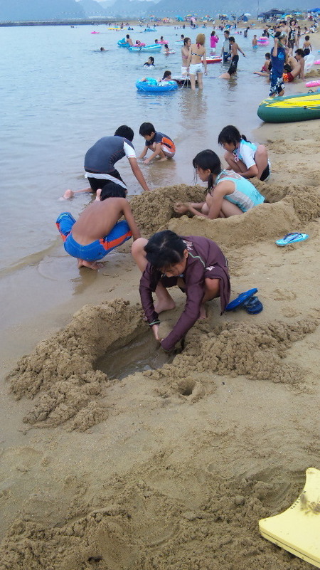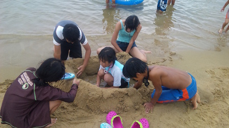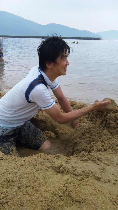 そして子供に戻った店長と成長した子供たちは、砂浜で横幅3メートル程の他の人に