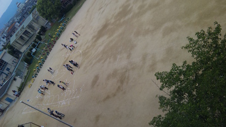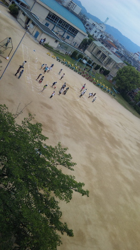 ちゃんと司令する子がいて、目から鼻まで何メートル!その通りに石灰で書いていく。