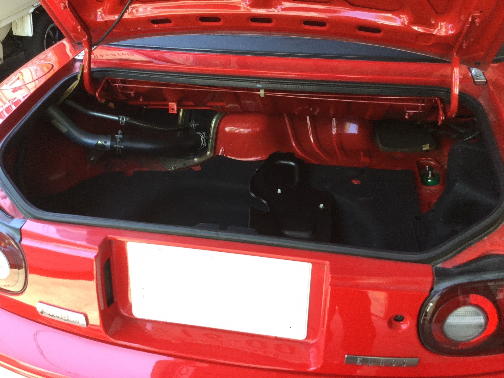 リヤのトランクルームの中に足回りのアッパーがあるのでまずは内張など邪魔なものを取り外していきます。