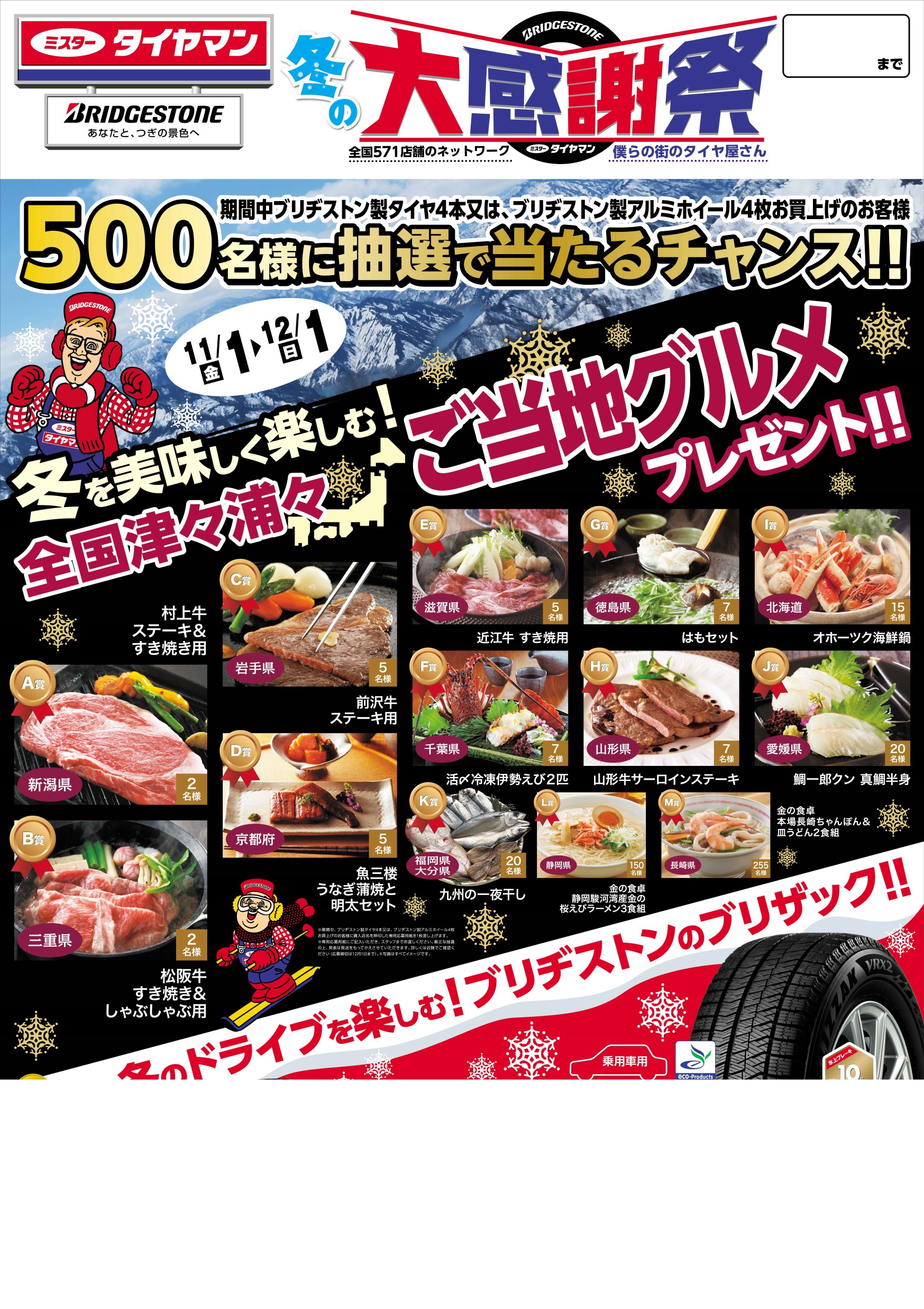 タイヤ4本またはアルミ4本お買い上げのお客様に抽選で500名様に当たります。