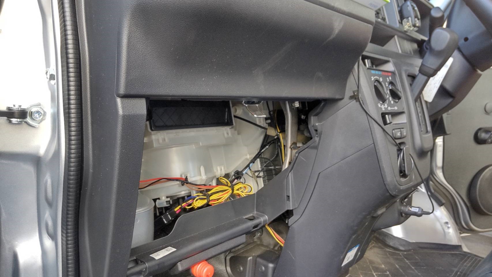 まずは、電源の取り回しから、グローボックスを取り外しまして、直結配線の取り回しです。