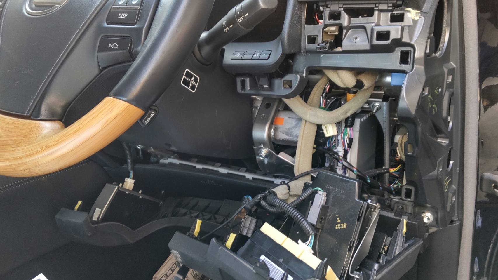 助手席側もバラバラです。配線及び本体を取り付けいたしまして、元に戻します。