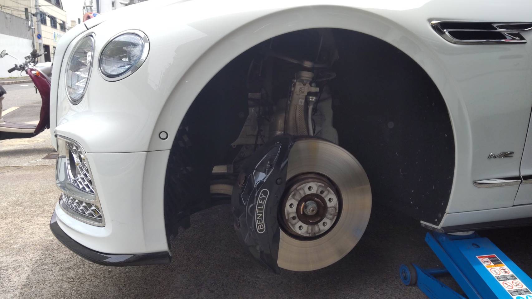 ジャッキアップも慎重に。キャリパーもどでかいです。何センチあるでしょうか。