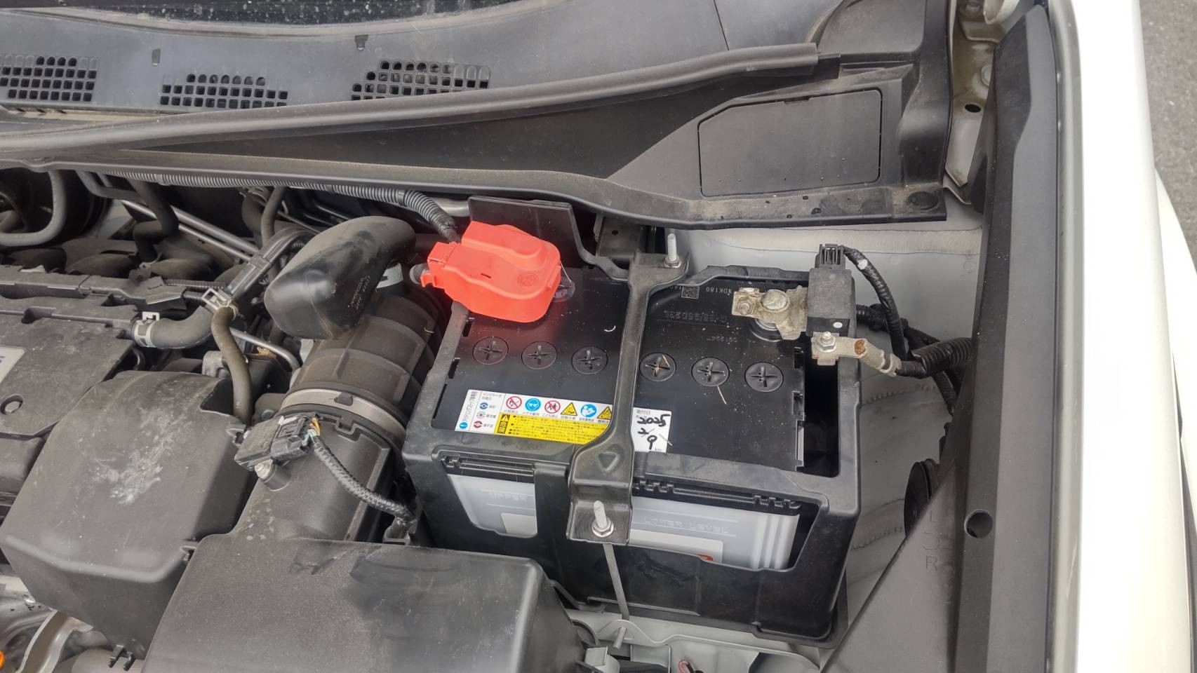 赤い端子のカバーの下に鎮座しているのがバッテリーになります。