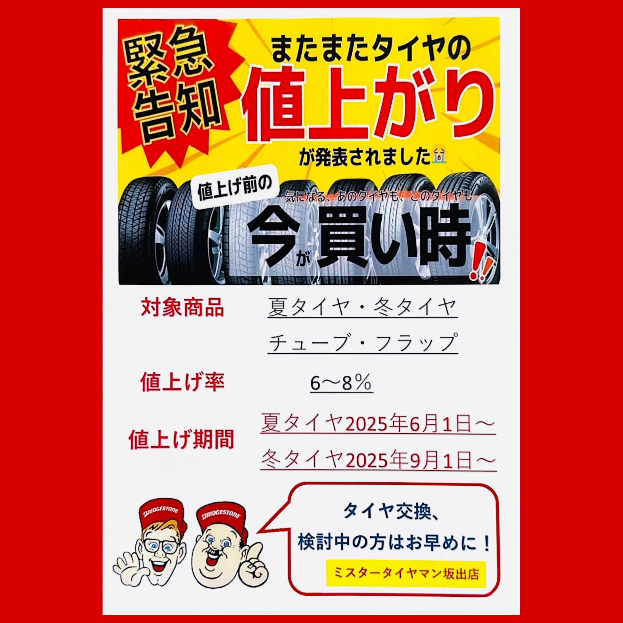 本日は、お知らせです。 BRIDGESTONEタイヤ値上がり決定しました(´;ω;`)