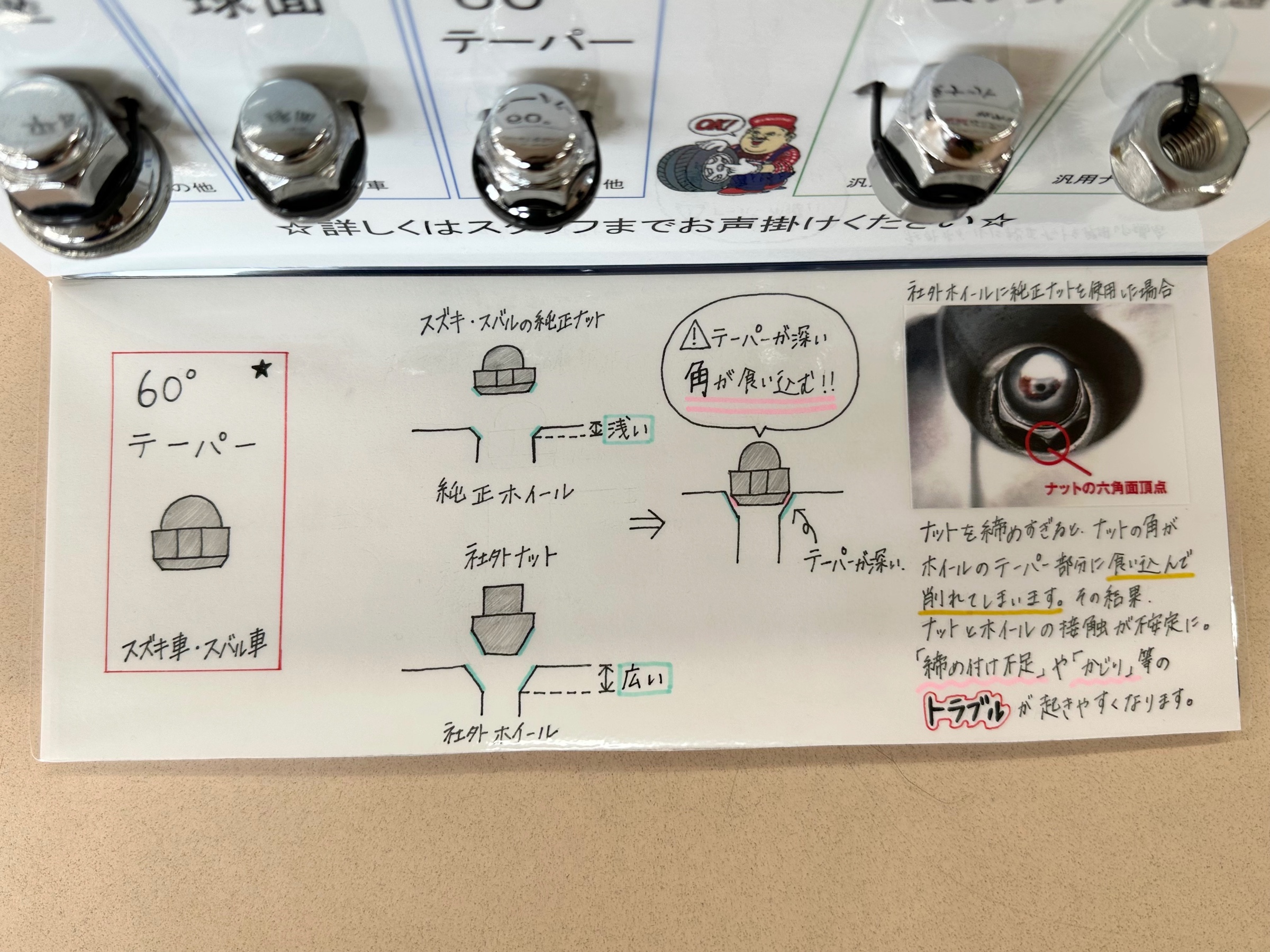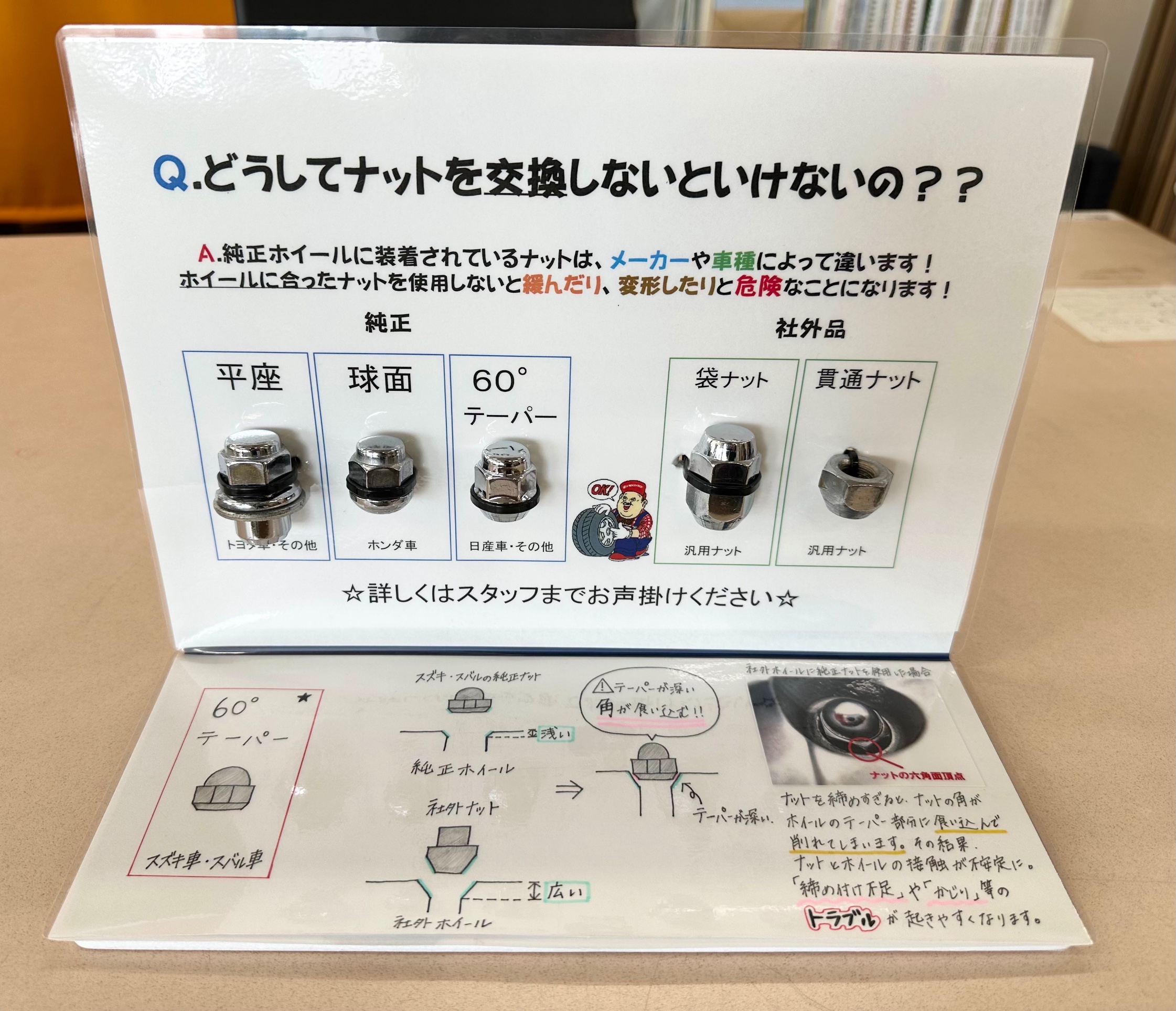 ホイールや、ナットを変える時は必ずタイヤ屋さん、車屋さんなどに確認をしましょう!!