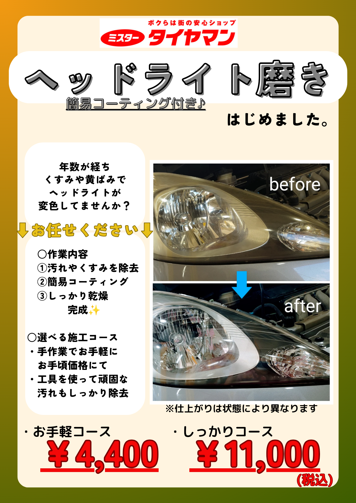 ピカピカヘッドライトで夜間の安心感を!!