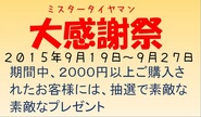 お客様に感謝をこめてイベント開催します!! 2015年9月15日 9月19日(土曜日)より9月27日(日曜日)の9日間にわたり、日頃の感謝をこめて大感謝祭を開催いたします。・エンジンオイル等のメンテナンス用品・夏タイヤ・スタッドレスタイヤ(そろそろ、この季節が来てます)など、お買い得商品を多数ご用意しております!!また、2000円以上お買い上げしていただいたお客様には、抽選で素敵なプレゼントをご用意しております!!!秋の大型連休(シルバーウィーク)に、ぜひタイヤマンにお越しくださいませ~。